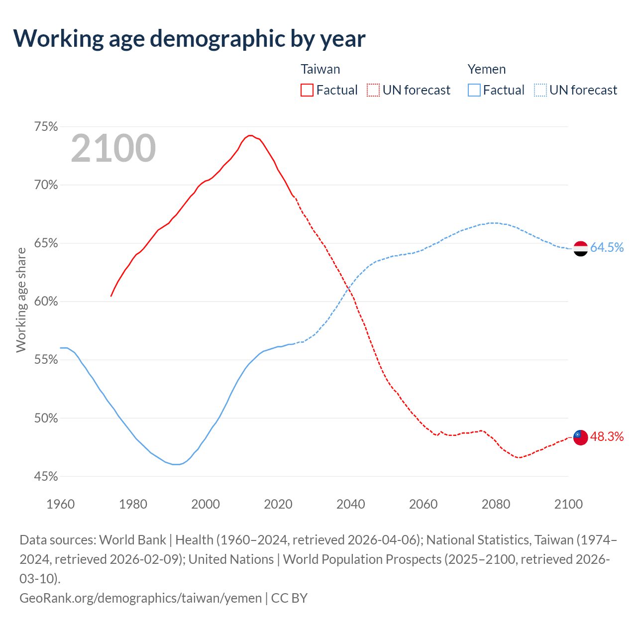 - Taiwan has 16.1M working age adults (aged 15-64) vs 24.4M in Yemen.