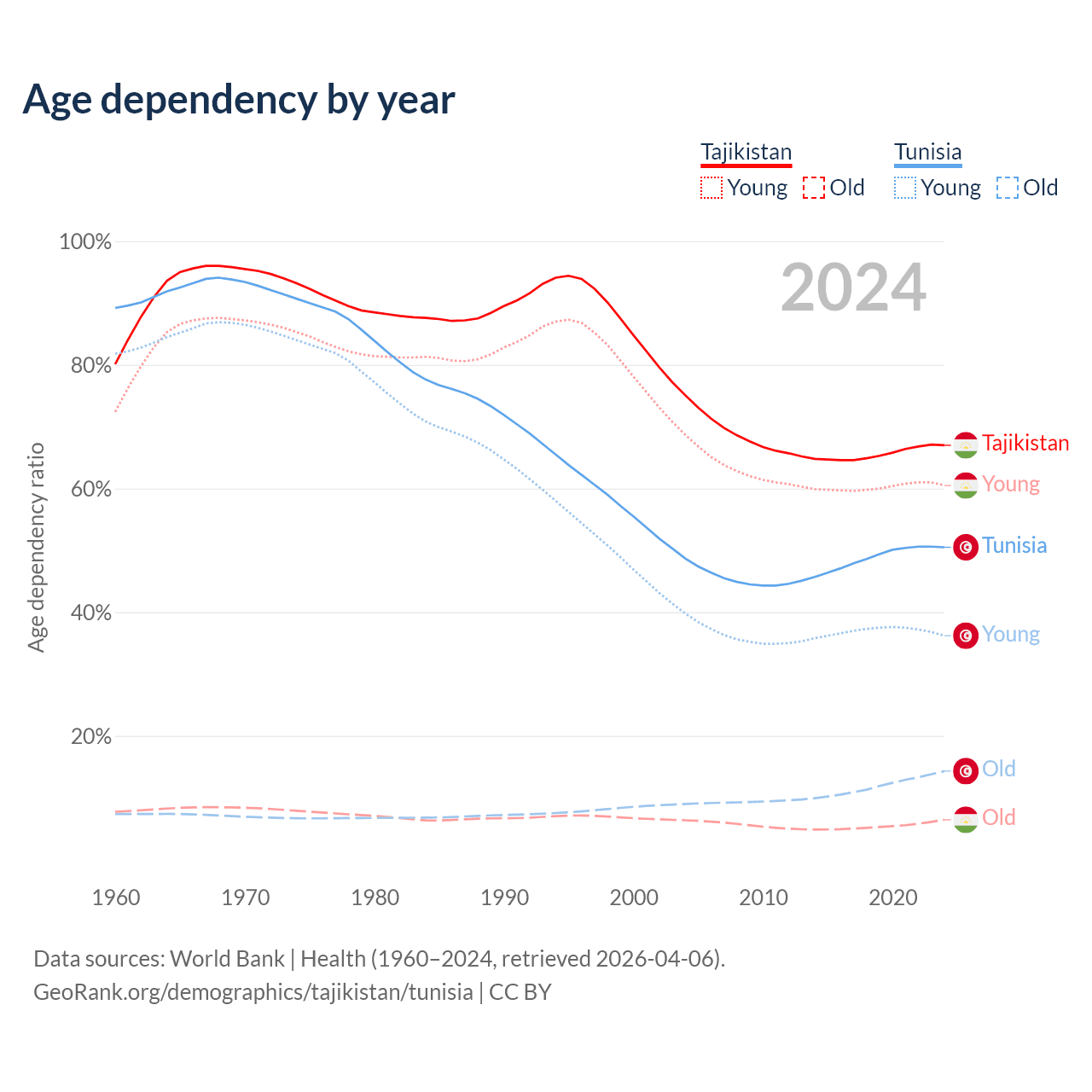 - Tajikistan is ranked 142/196 by median age (oldest to youngest) vs 86/196 for Tunisia.