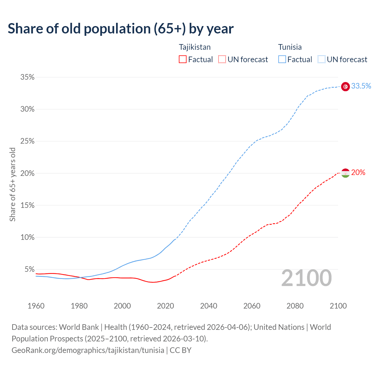 The share of older people aged 65 and over is 3.85% in Tajikistan and 9.53% in Tunisia. Life expectancy in Tajikistan compared to Tunisia .