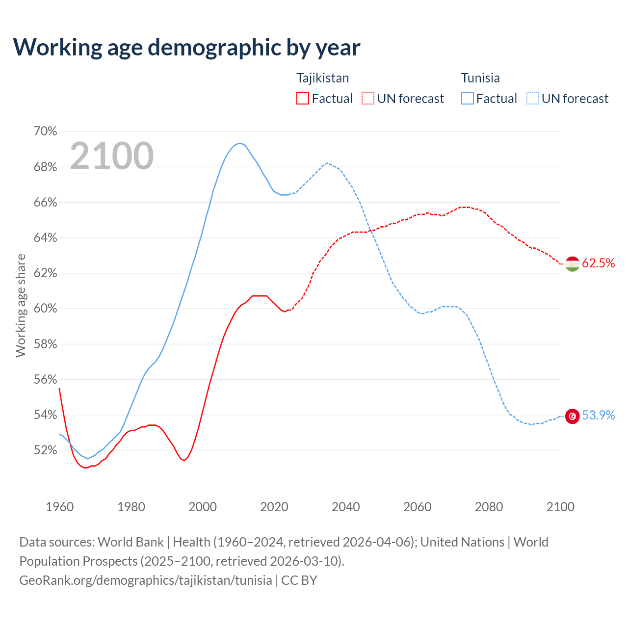 - Tajikistan has 6.61M working age adults (aged 15-64) vs 8.26M in Tunisia.