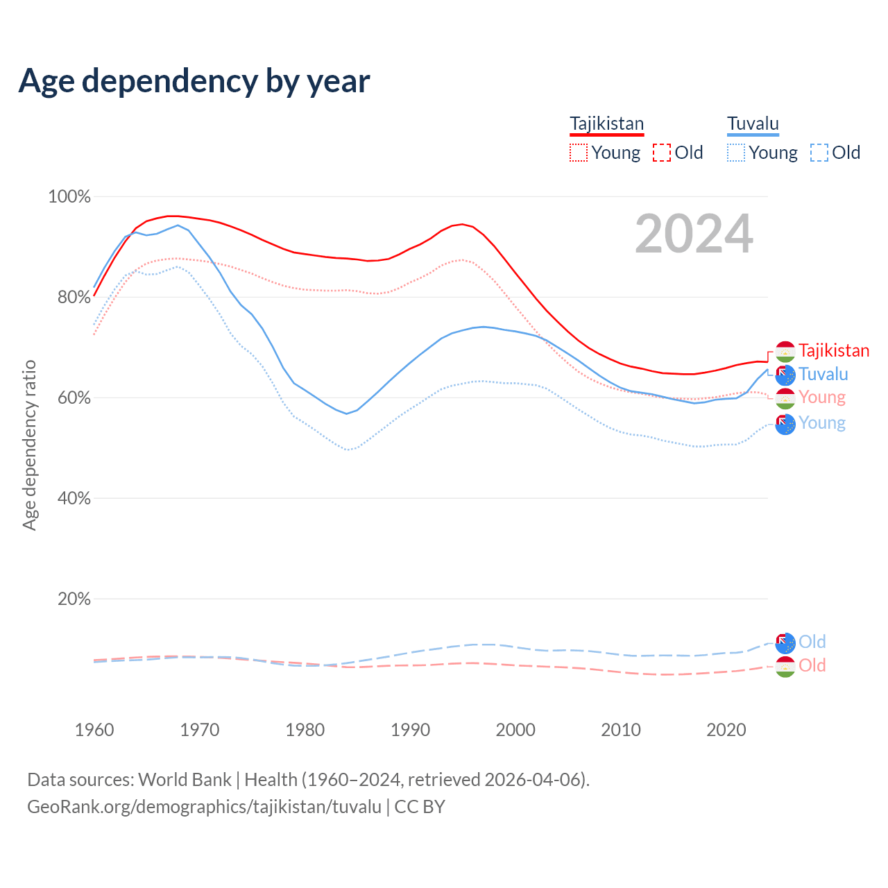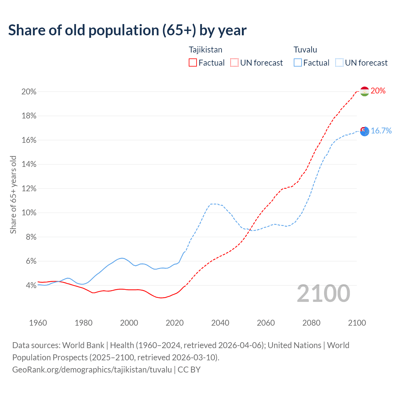 - The share of old-age demographic (65+) in Tajikistan is 3.85% vs 6.67% in Tuvalu.