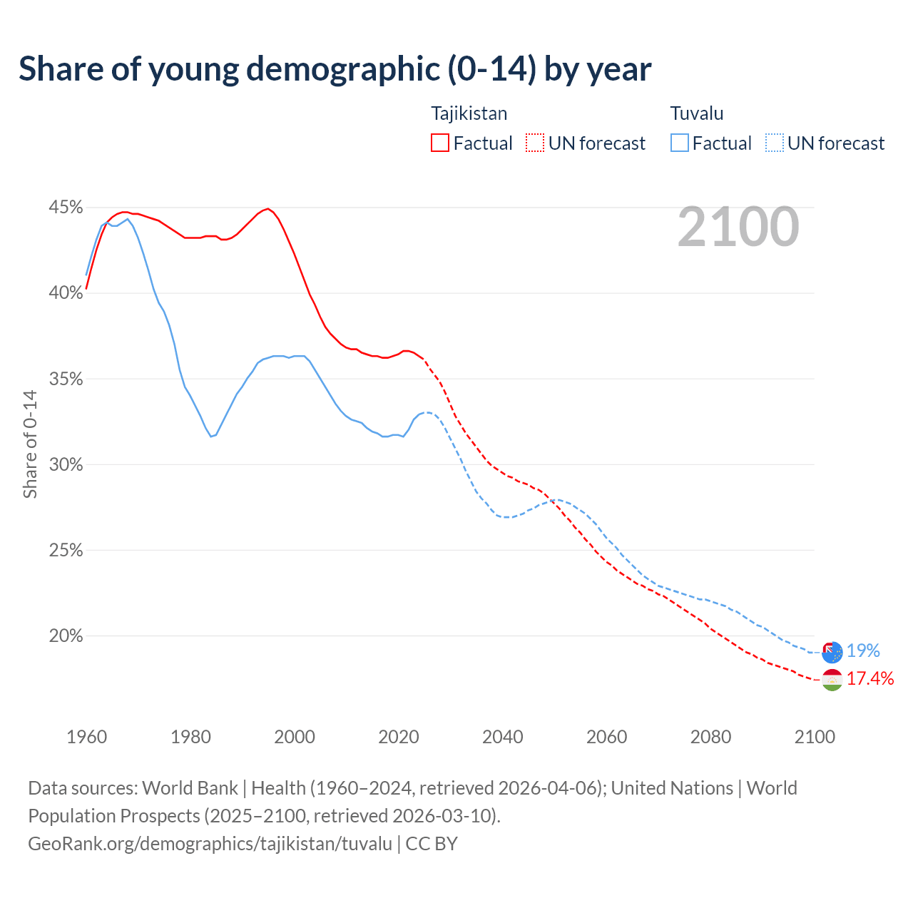 - The share of young demographic (0-15 years old) in Tajikistan is 36.3% vs 32.9% in Tuvalu.