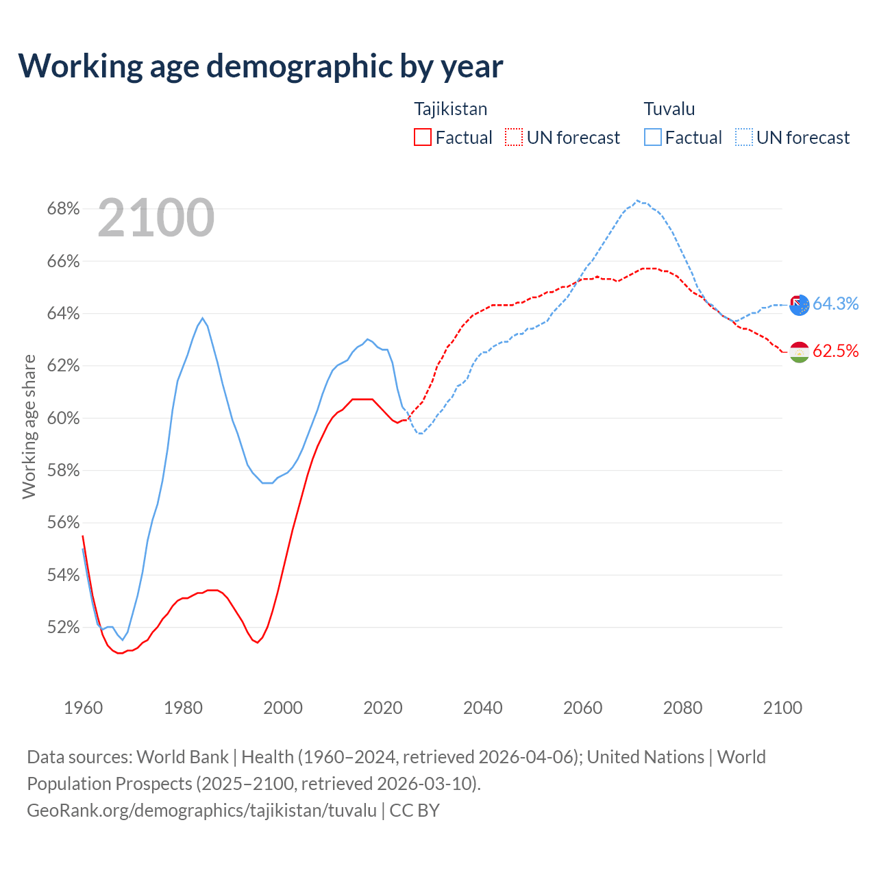 - Tajikistan has 6.61M working age adults (aged 15-64) vs 5.64K in Tuvalu.