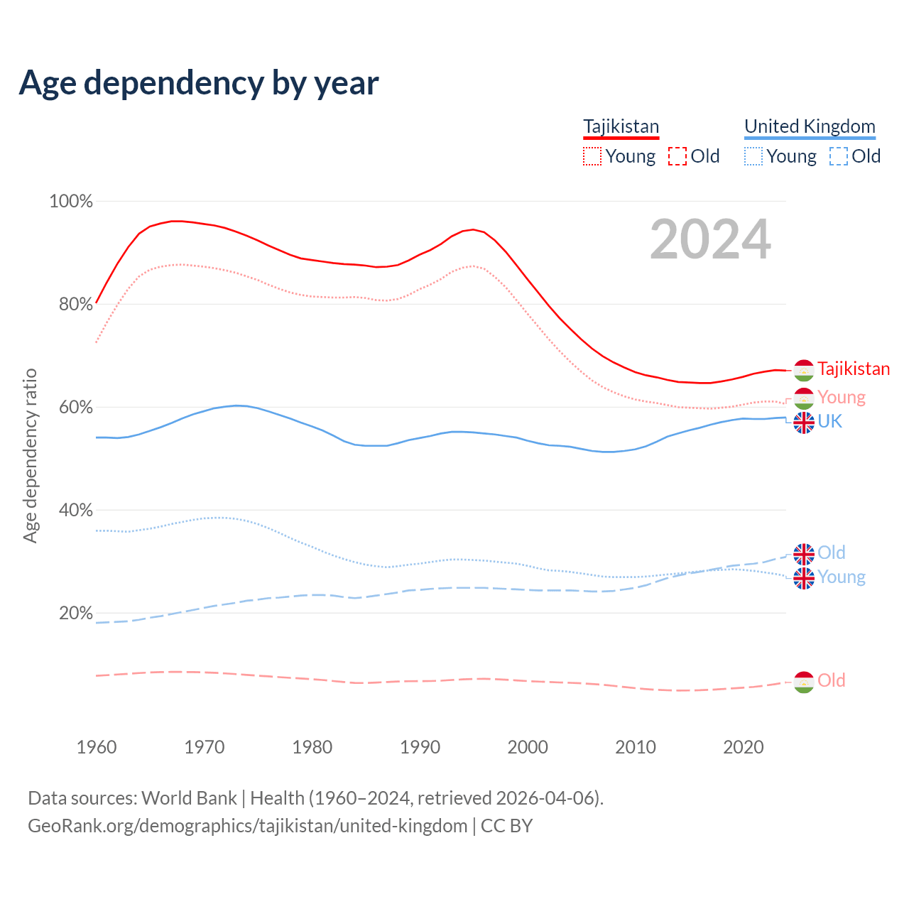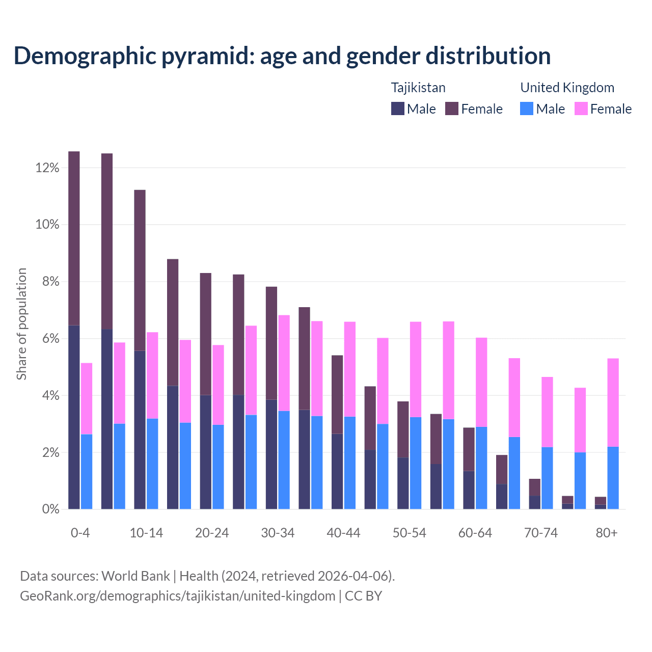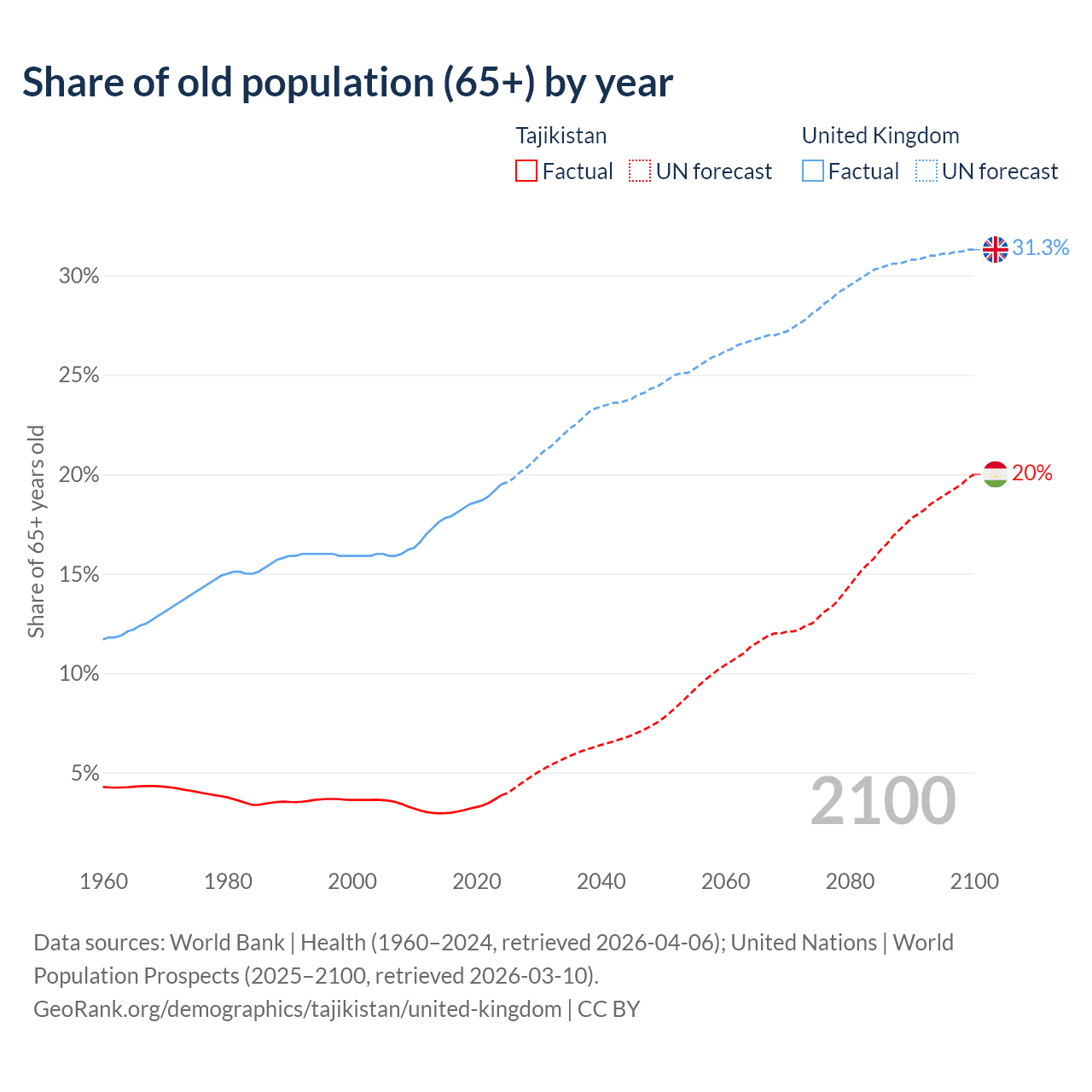 The share of older people aged 65 and over is 3.85% in Tajikistan and 19.5% in the United Kingdom. Life expectancy in Tajikistan compared to the United Kingdom .