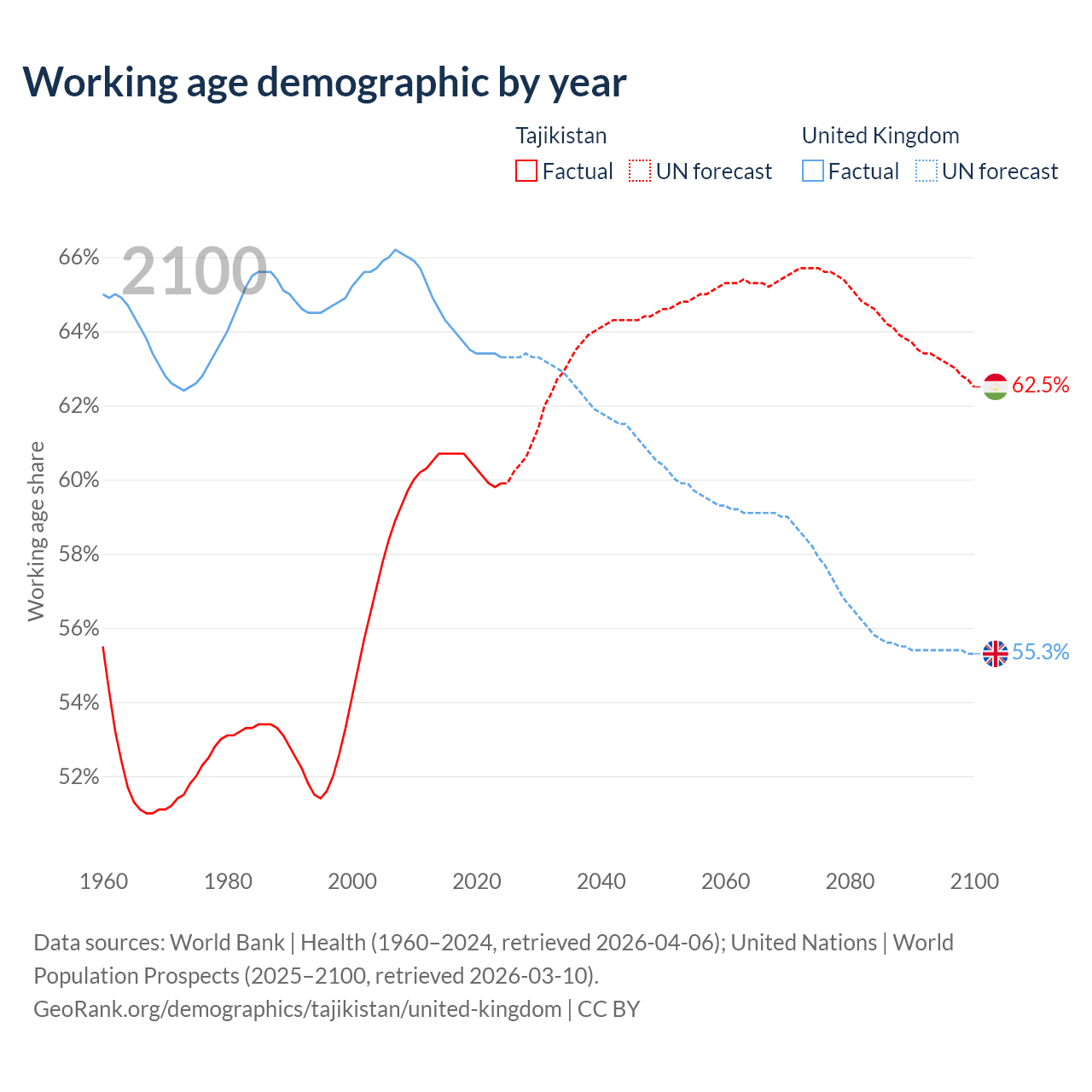 - Tajikistan has 6.61M working age adults (aged 15-64) vs 44.4M in the United Kingdom.