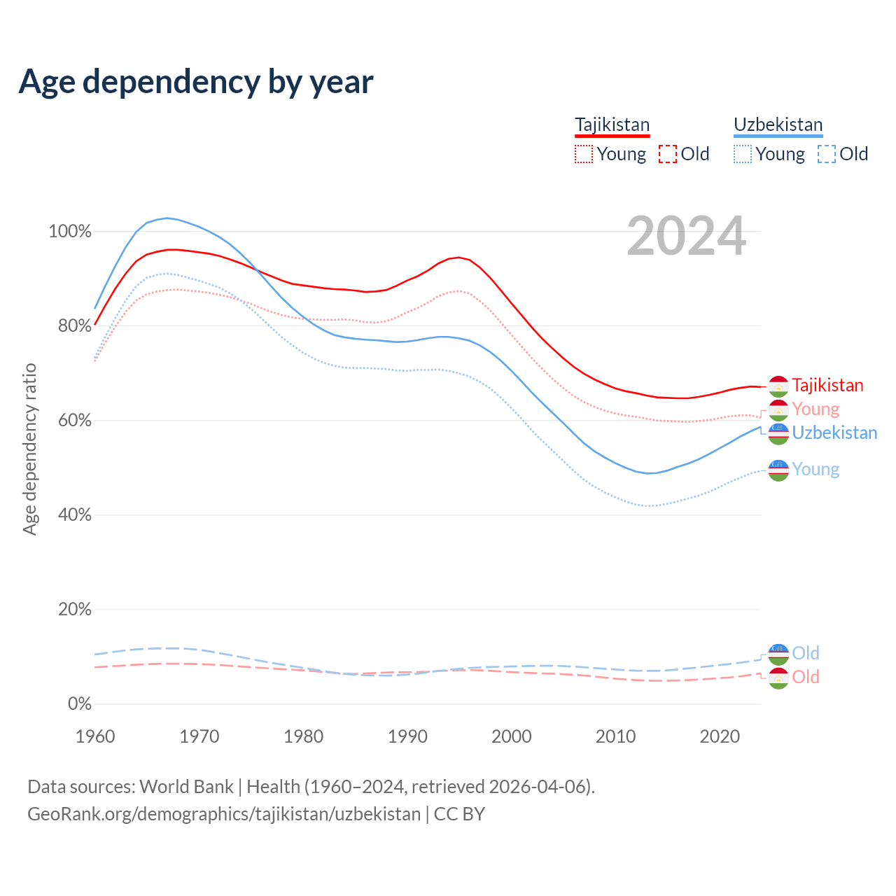 The share of older people aged 65 and over is 3.85% in Tajikistan and 5.86% in Uzbekistan. Life expectancy in Tajikistan compared to Uzbekistan .