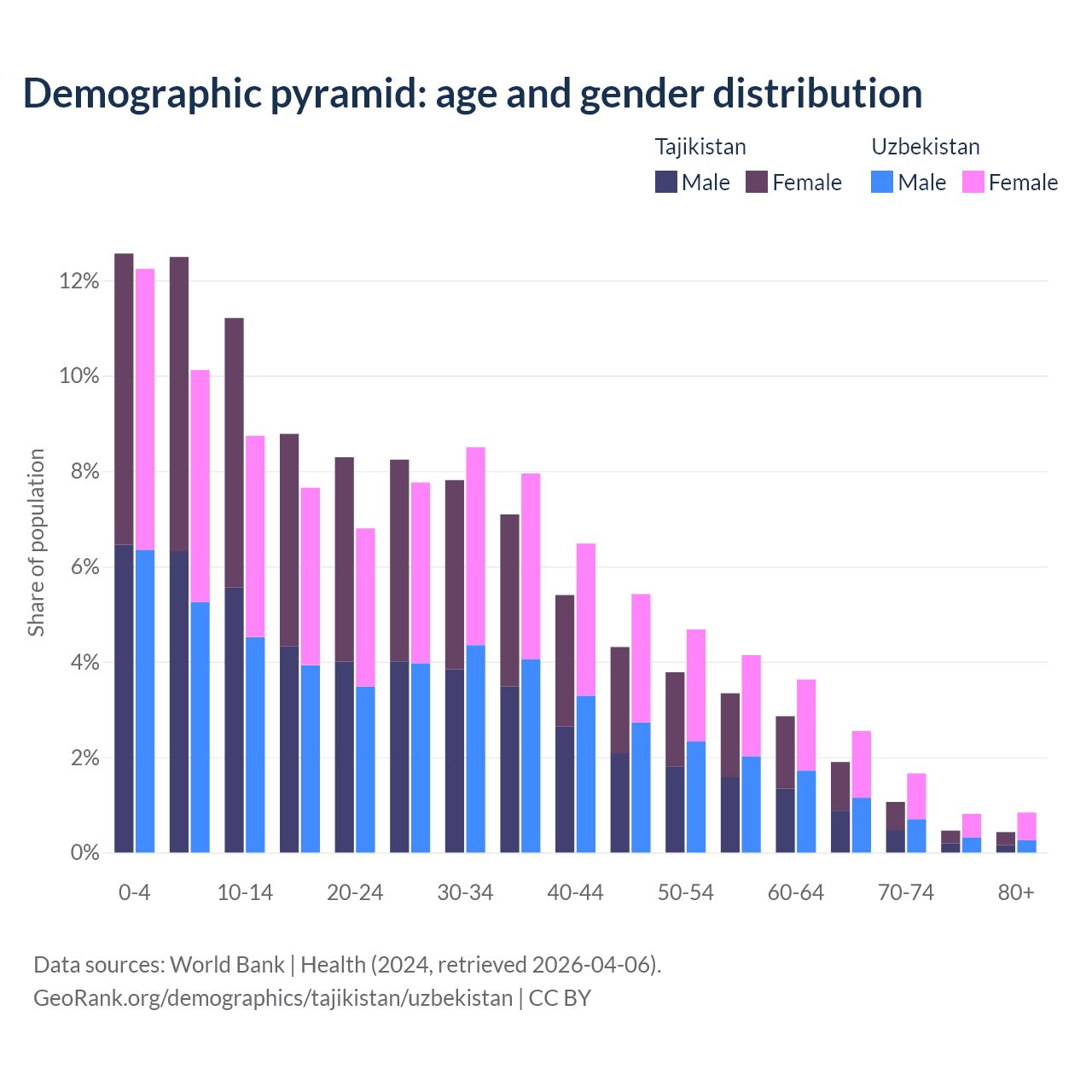 - As of 2026, the population of Tajikistan is 11M vs 37.9M in Uzbekistan - 3.44 times difference.