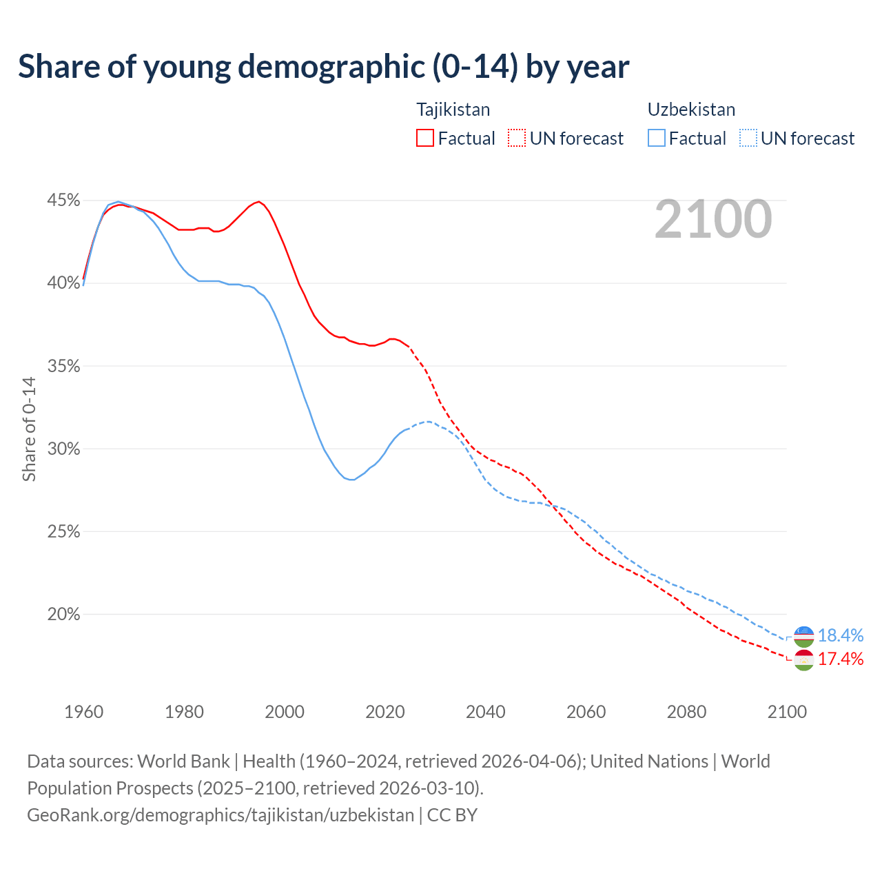 - Tajikistan is ranked 142/196 by median age (oldest to youngest) vs 116/196 for Uzbekistan.