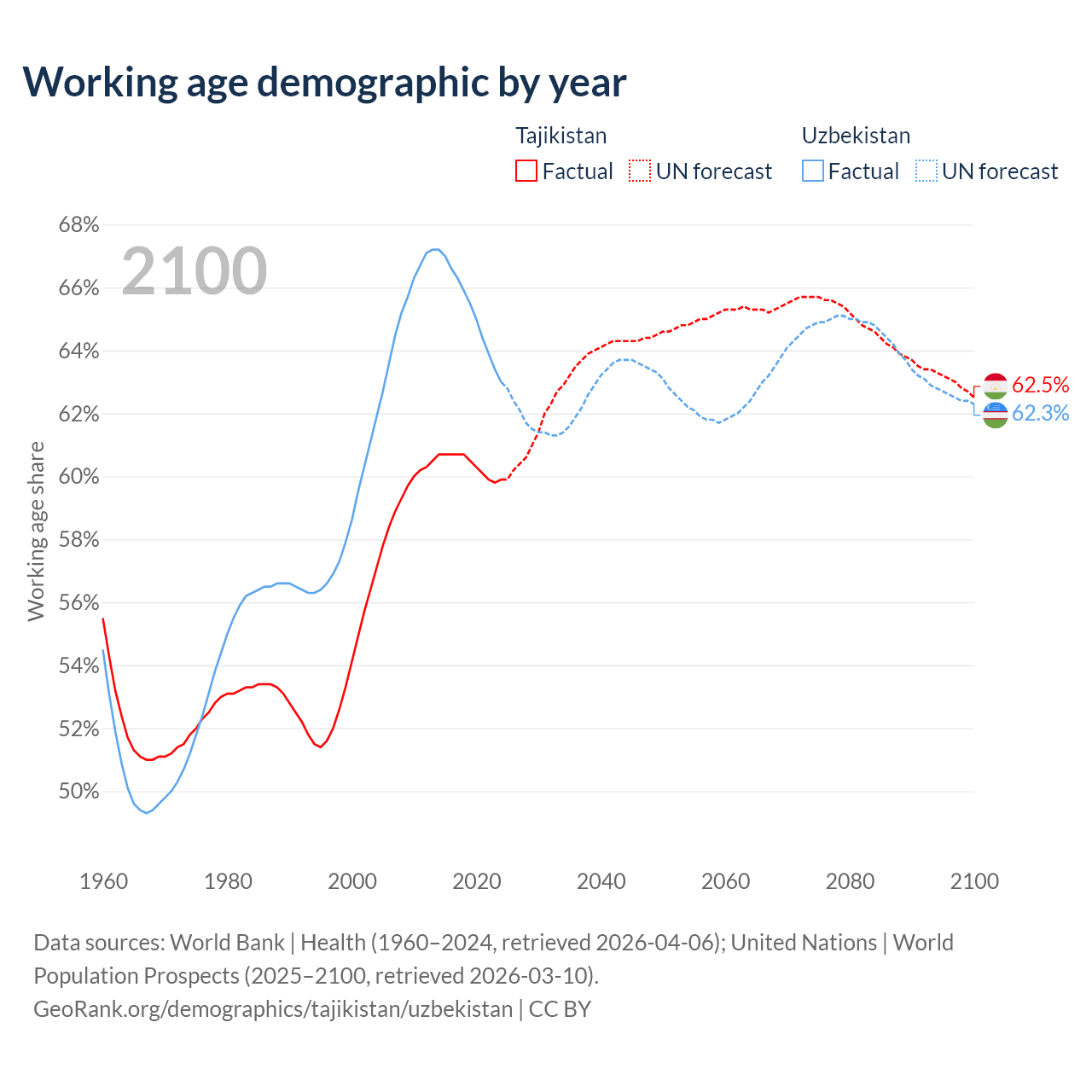 - Tajikistan has 6.61M working age adults (aged 15-64) vs 23.9M in Uzbekistan.