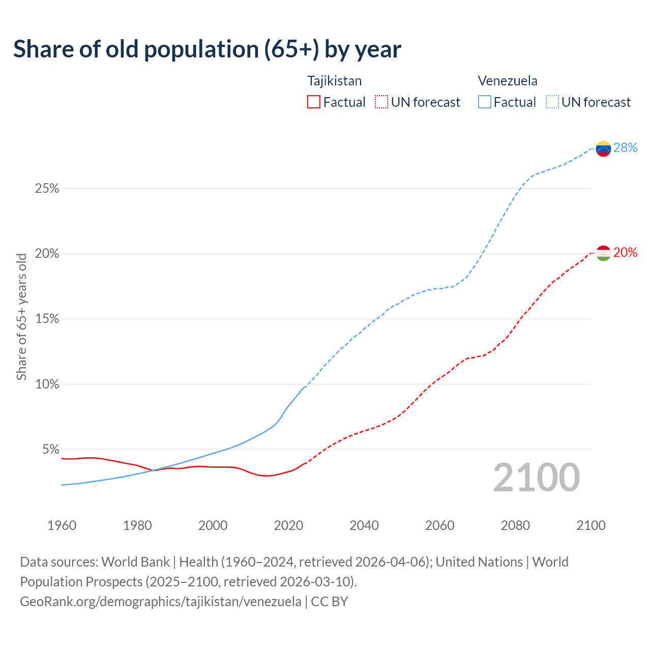The share of older people aged 65 and over is 3.85% in Tajikistan and 9.68% in Venezuela. Life expectancy in Tajikistan compared to Venezuela .