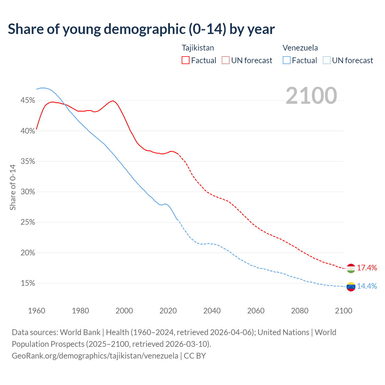 - The share of young demographic (0-15 years old) in Tajikistan is 36.3% vs 25.5% in Venezuela.