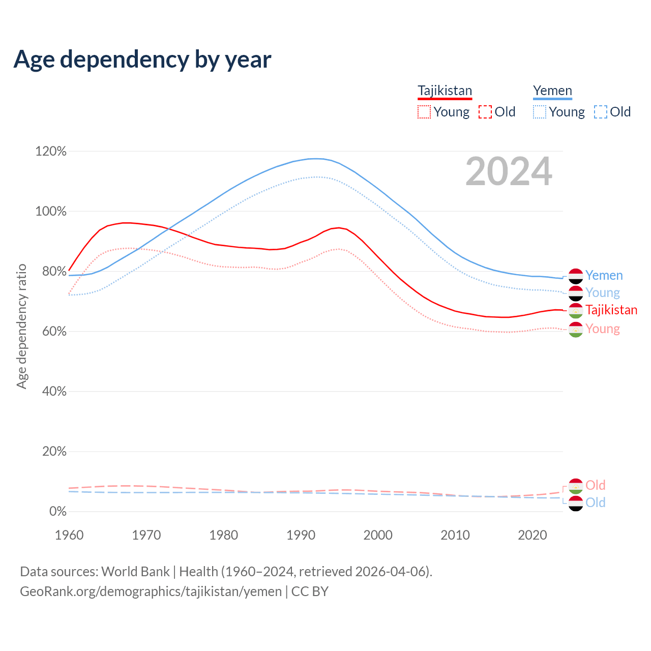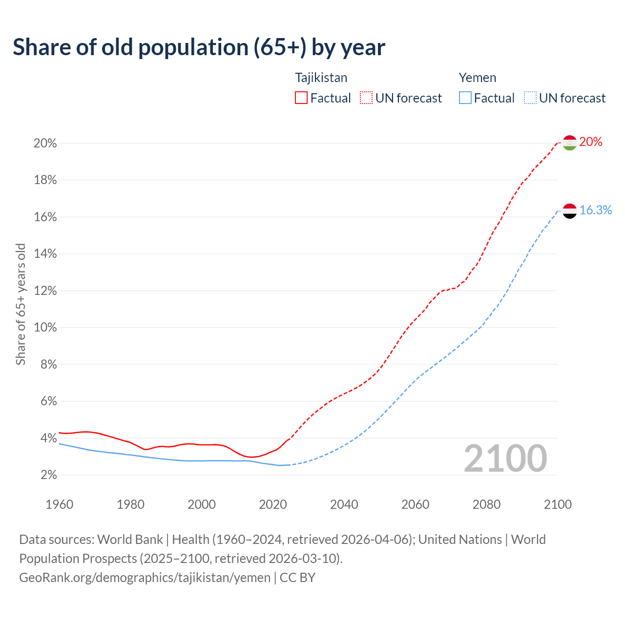 - The share of old-age demographic (65+) in Tajikistan is 3.85% vs 2.52% in Yemen.