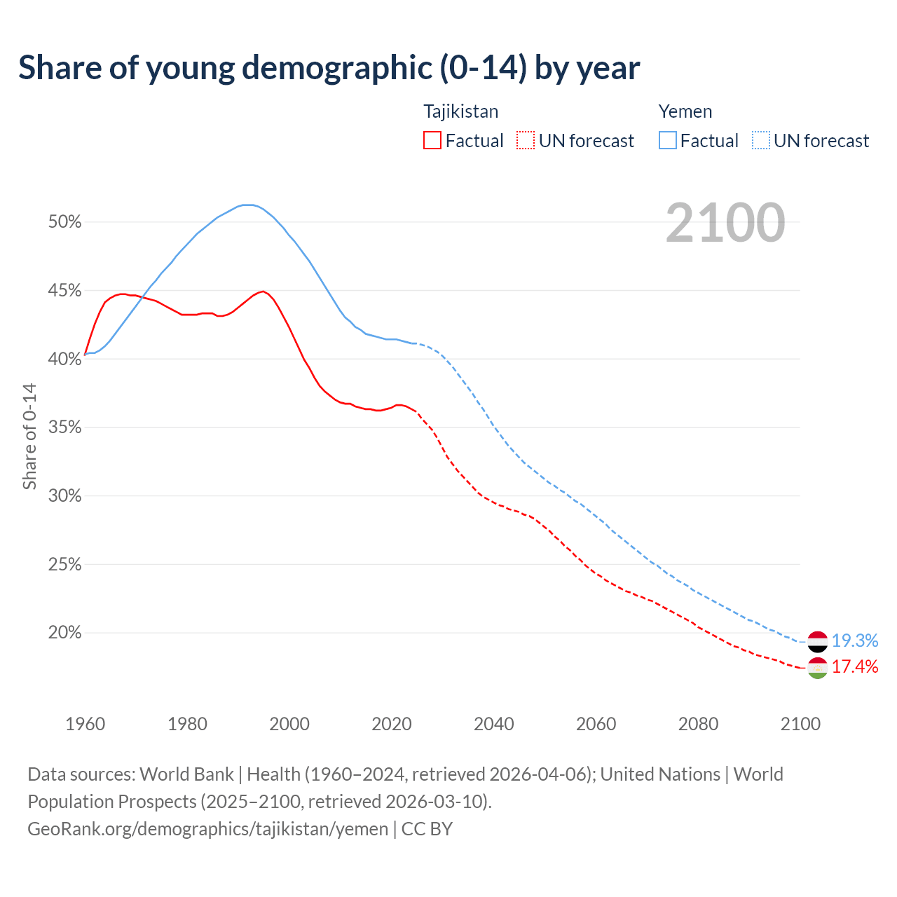 - The share of young demographic (0-15 years old) in Tajikistan is 36.3% vs 41.1% in Yemen.