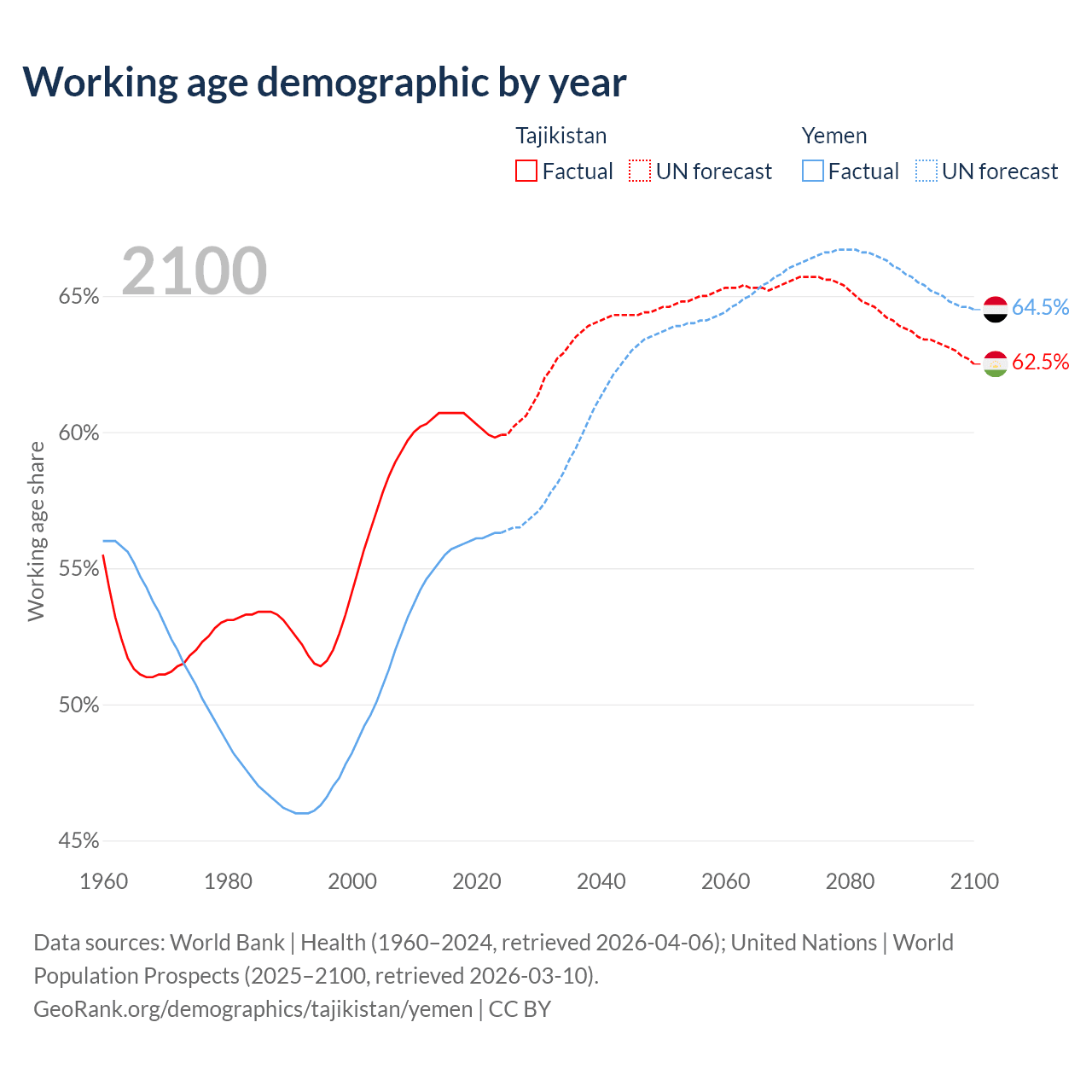 - Tajikistan has 6.61M working age adults (aged 15-64) vs 24.4M in Yemen.