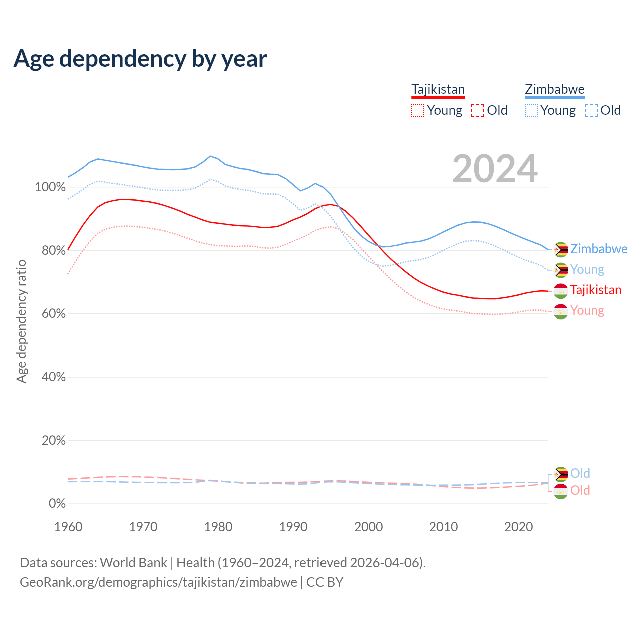 The share of older people aged 65 and over is 3.85% in Tajikistan and 3.6% in Zimbabwe. Life expectancy in Tajikistan compared to Zimbabwe .