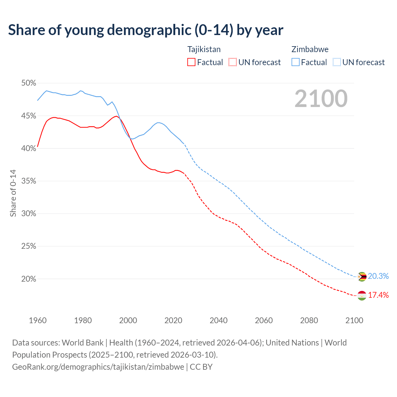 - The share of young demographic (0-15 years old) in Tajikistan is 36.3% vs 40.9% in Zimbabwe.