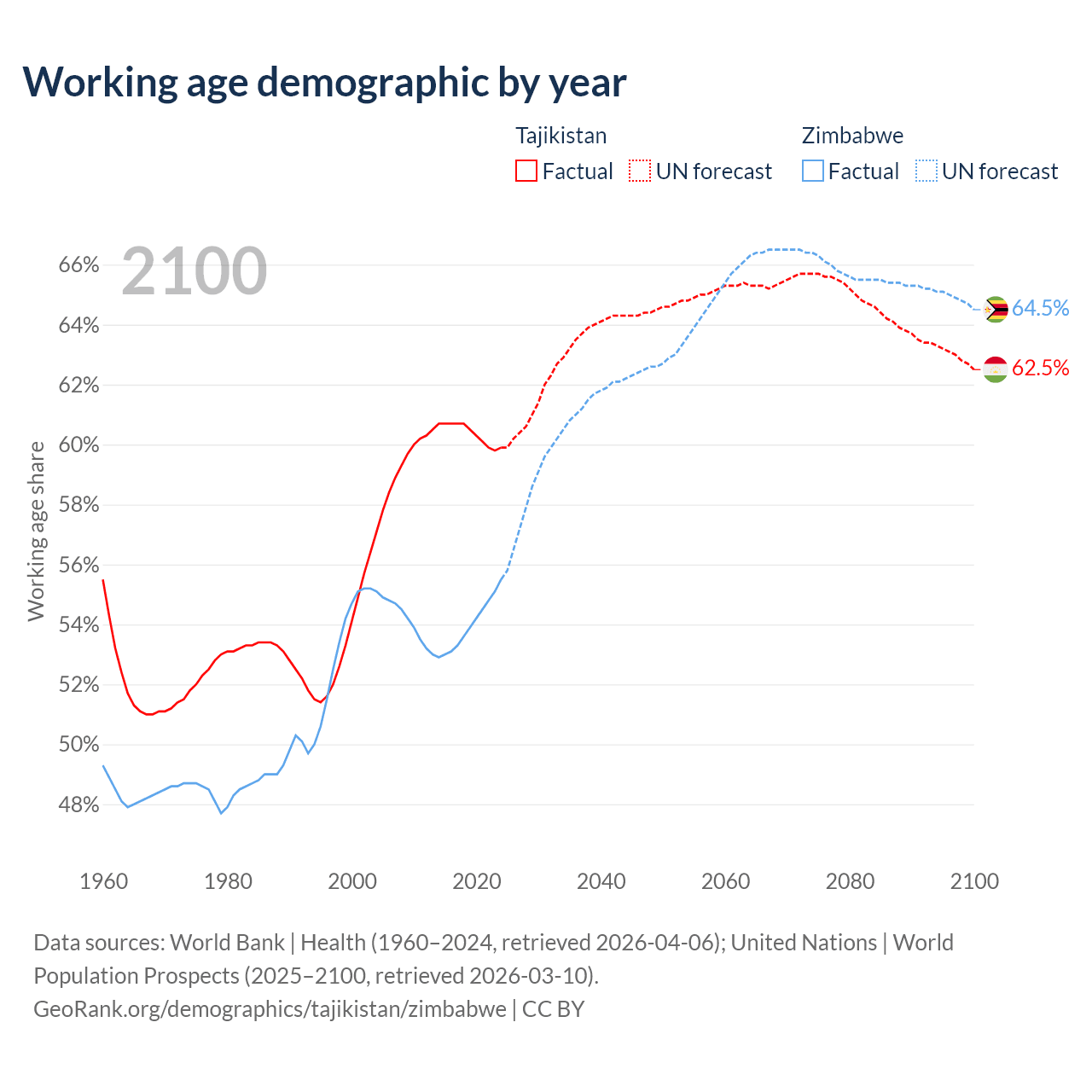 Median age Tajikistan vs Zimbabwe, 1960-2100