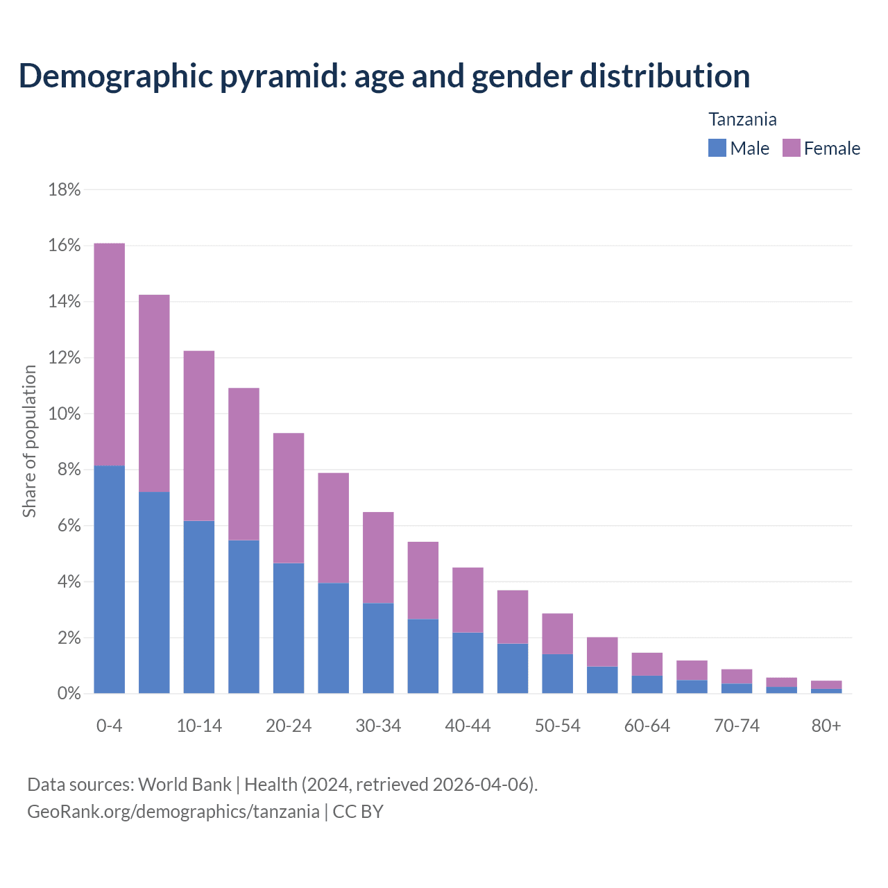 With a population of 68.6M people, Tanzania has a median age of 18.4 years which makes it the 184/196 oldest country. 42.5% of the demographic are children 0-14 years old, 54.4% are working-age people aged 15-64, and 3.05% are older population aged 65+ years.