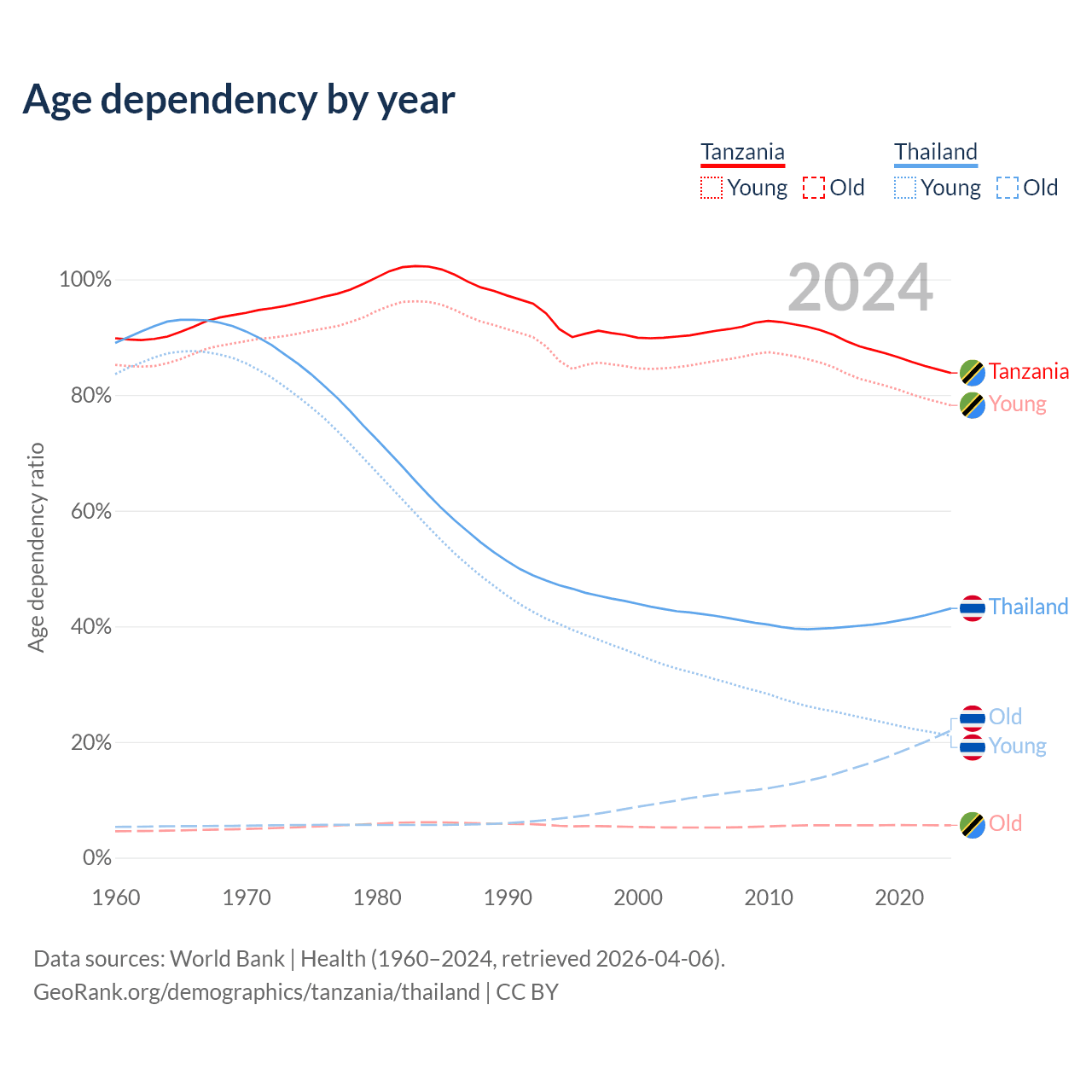 - Tanzania is ranked 184/196 by median age (oldest to youngest) vs 40/196 for Thailand.