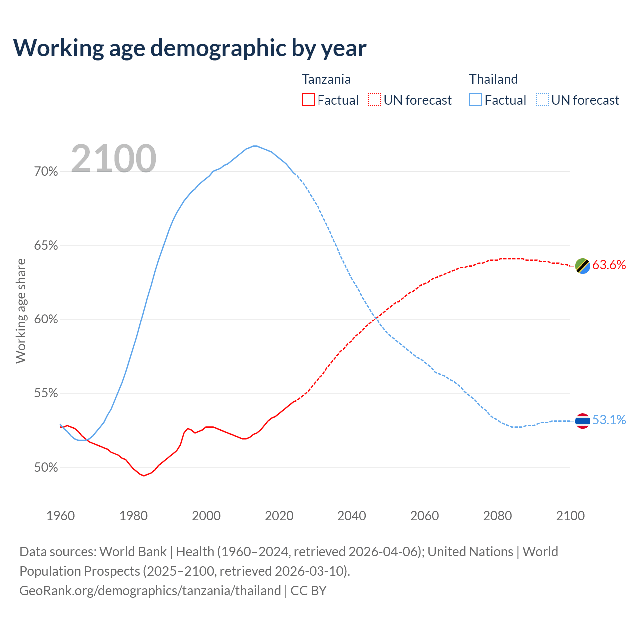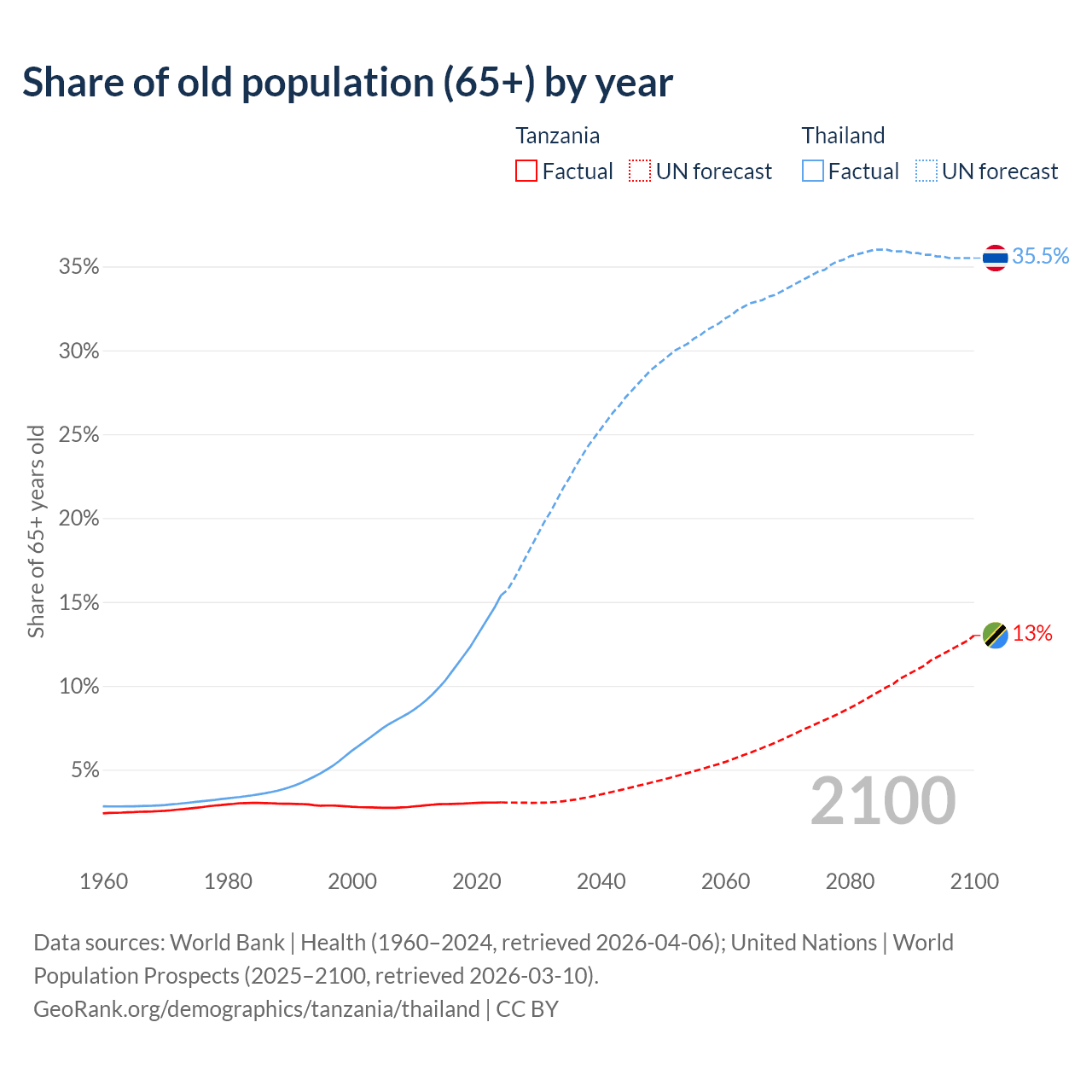 The share of older people aged 65 and over is 3.05% in Tanzania and 15.4% in Thailand. Life expectancy in Tanzania compared to Thailand .