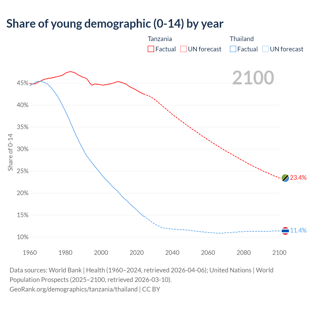 - The median age in Tanzania is 18.4 years compared to 41.1 years in Thailand.