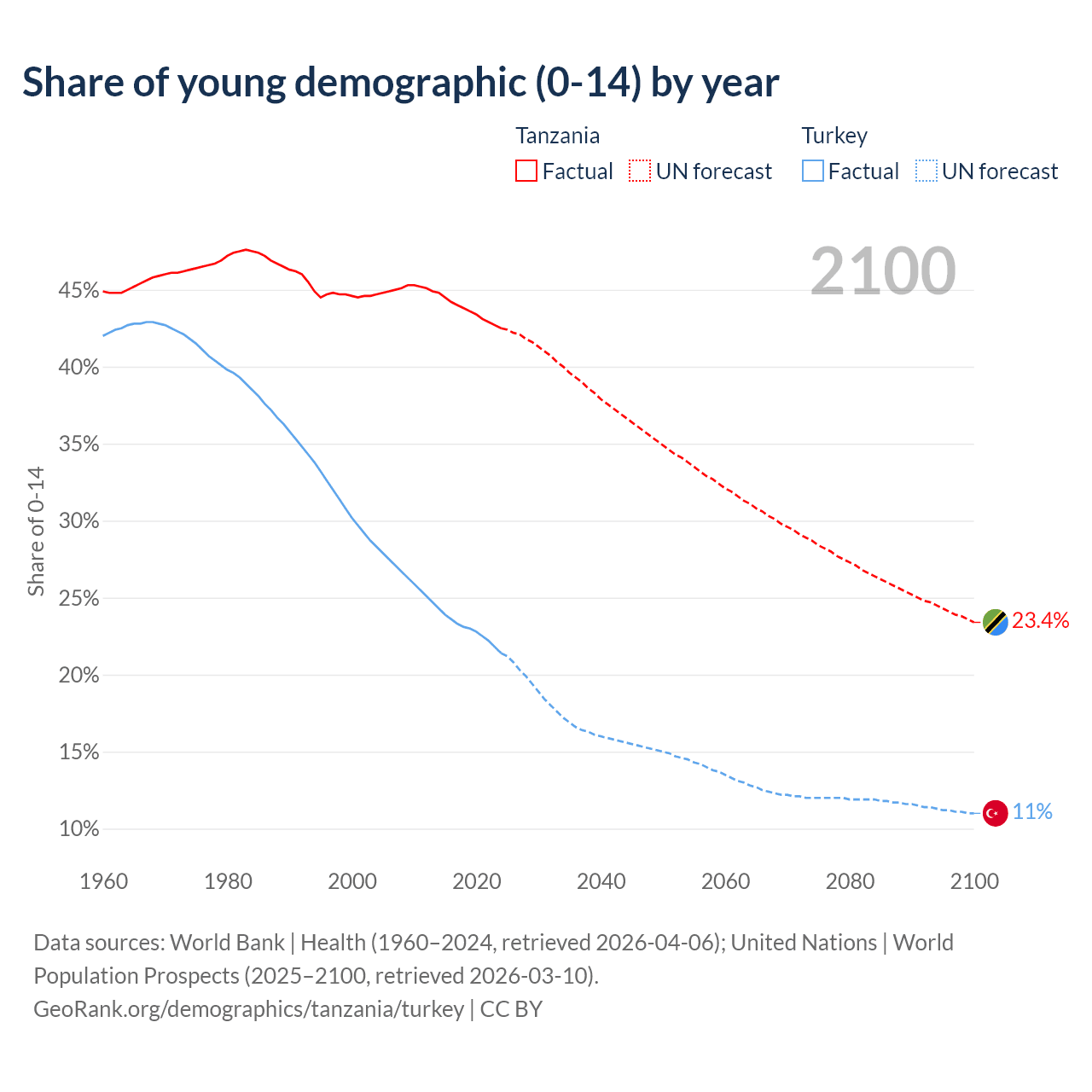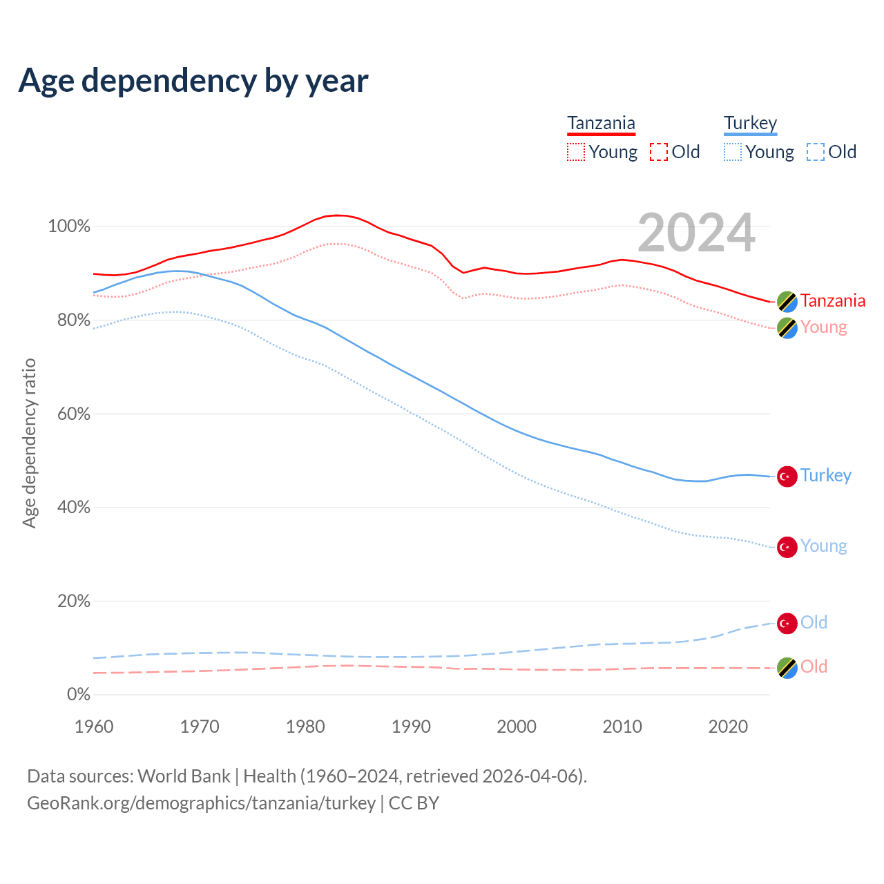 - Tanzania is ranked 184/196 by median age (oldest to youngest) vs 83/196 for Turkey.