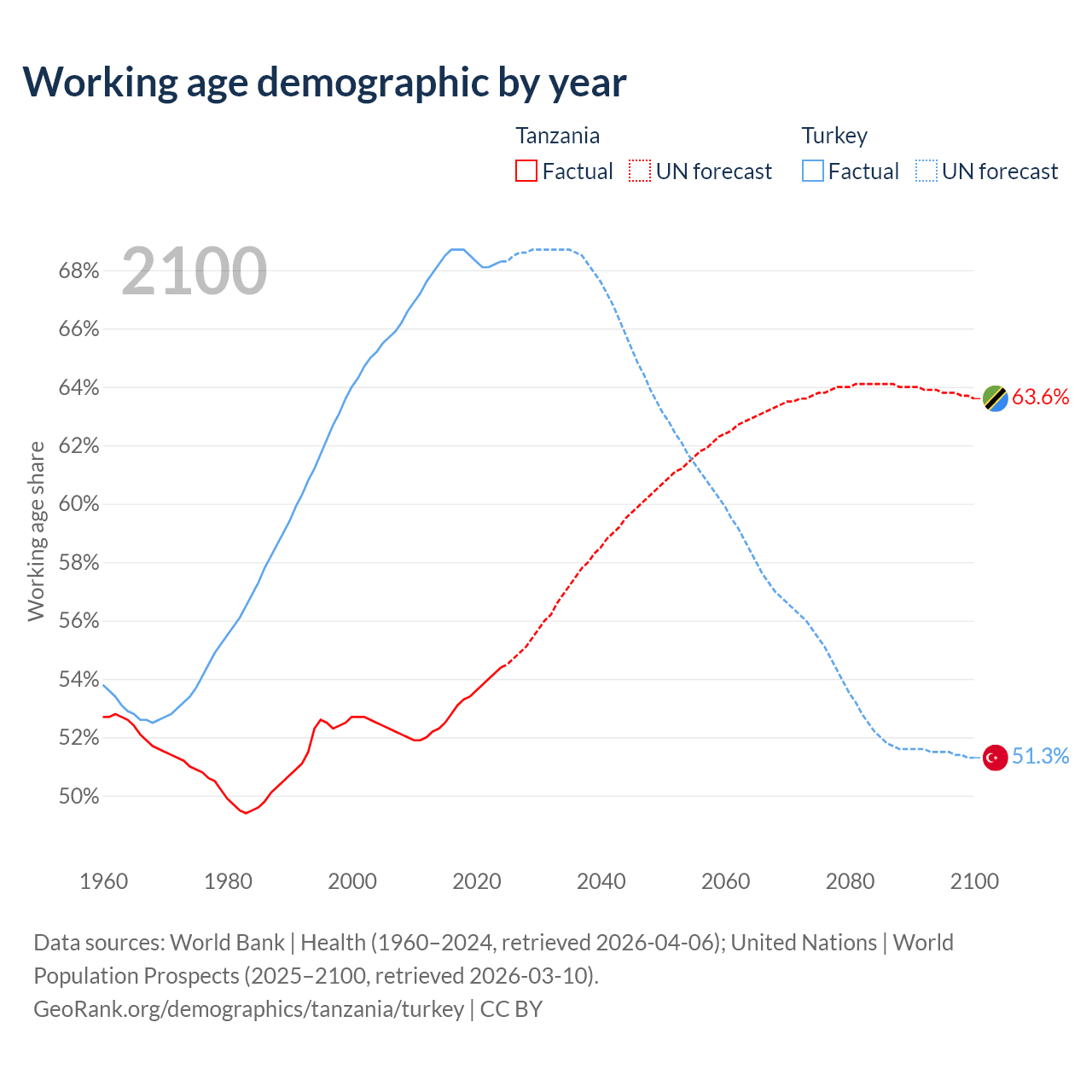 - Tanzania has 39.8M working age adults (aged 15-64) vs 58.7M in Turkey.