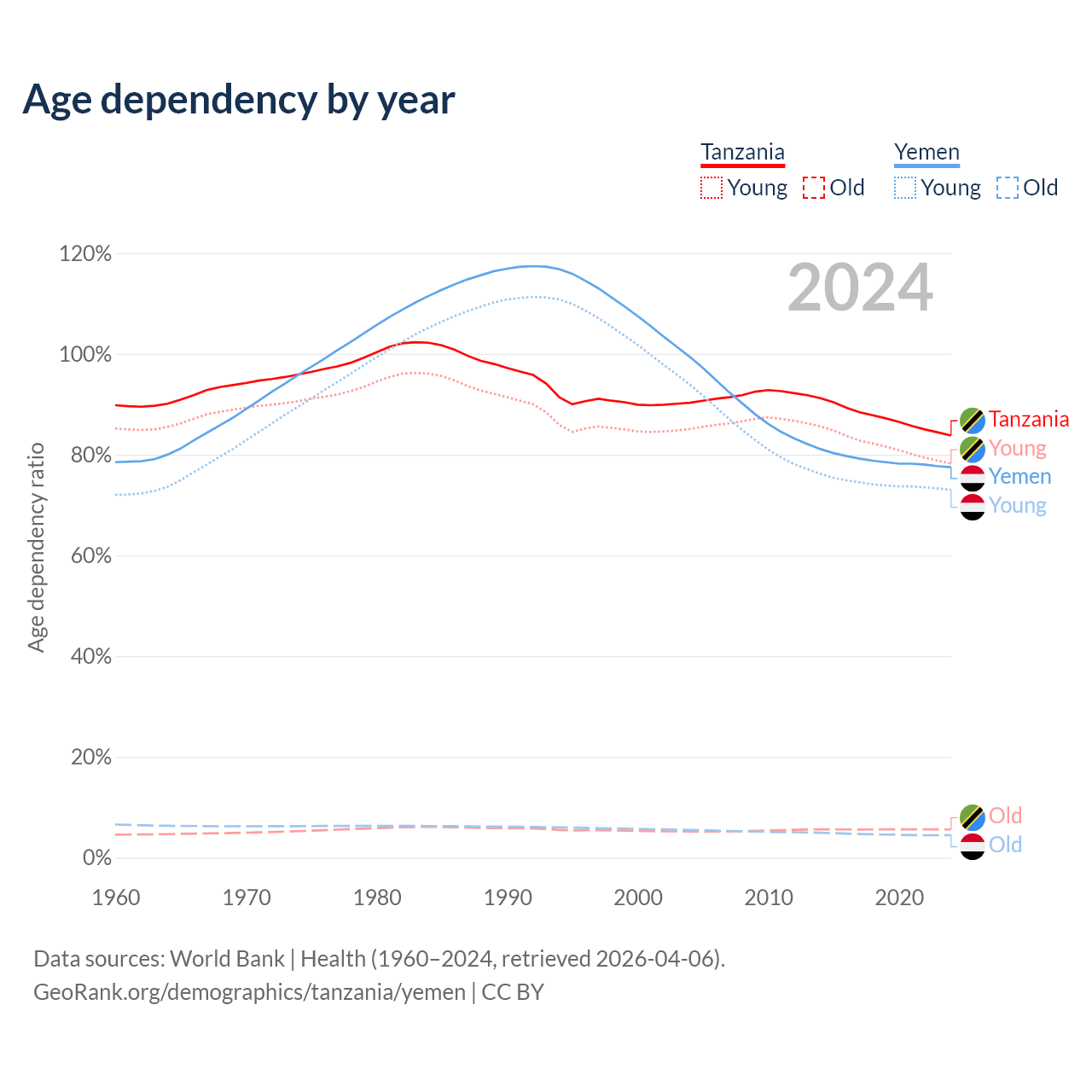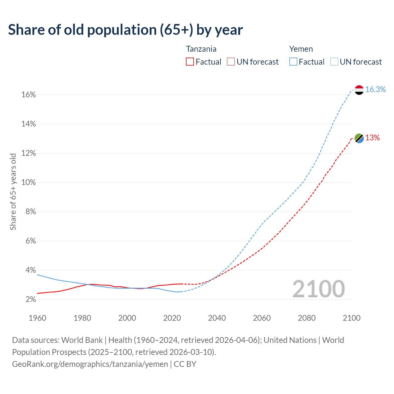 - The share of old-age demographic (65+) in Tanzania is 3.05% vs 2.52% in Yemen.