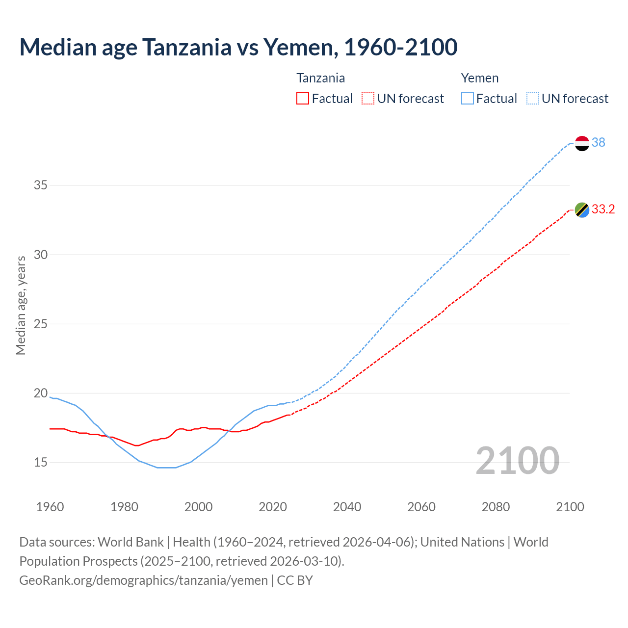 - Tanzania is ranked 184/196 by median age (oldest to youngest) vs 174/196 for Yemen.