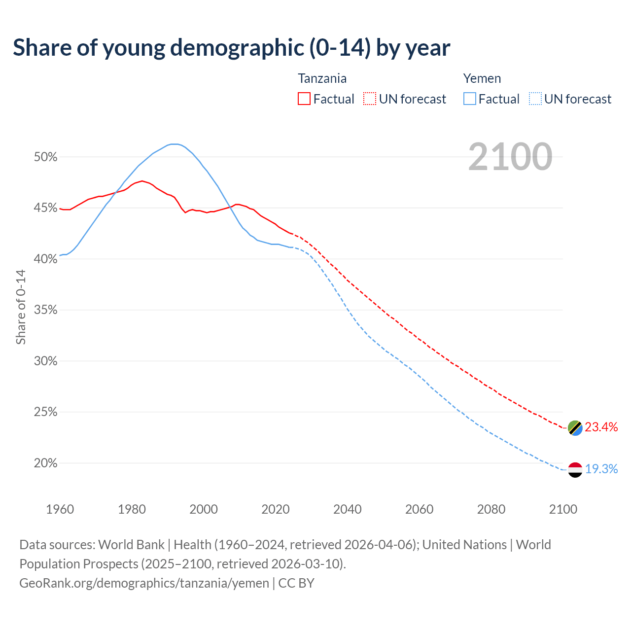 - The share of young demographic (0-15 years old) in Tanzania is 42.5% vs 41.1% in Yemen.