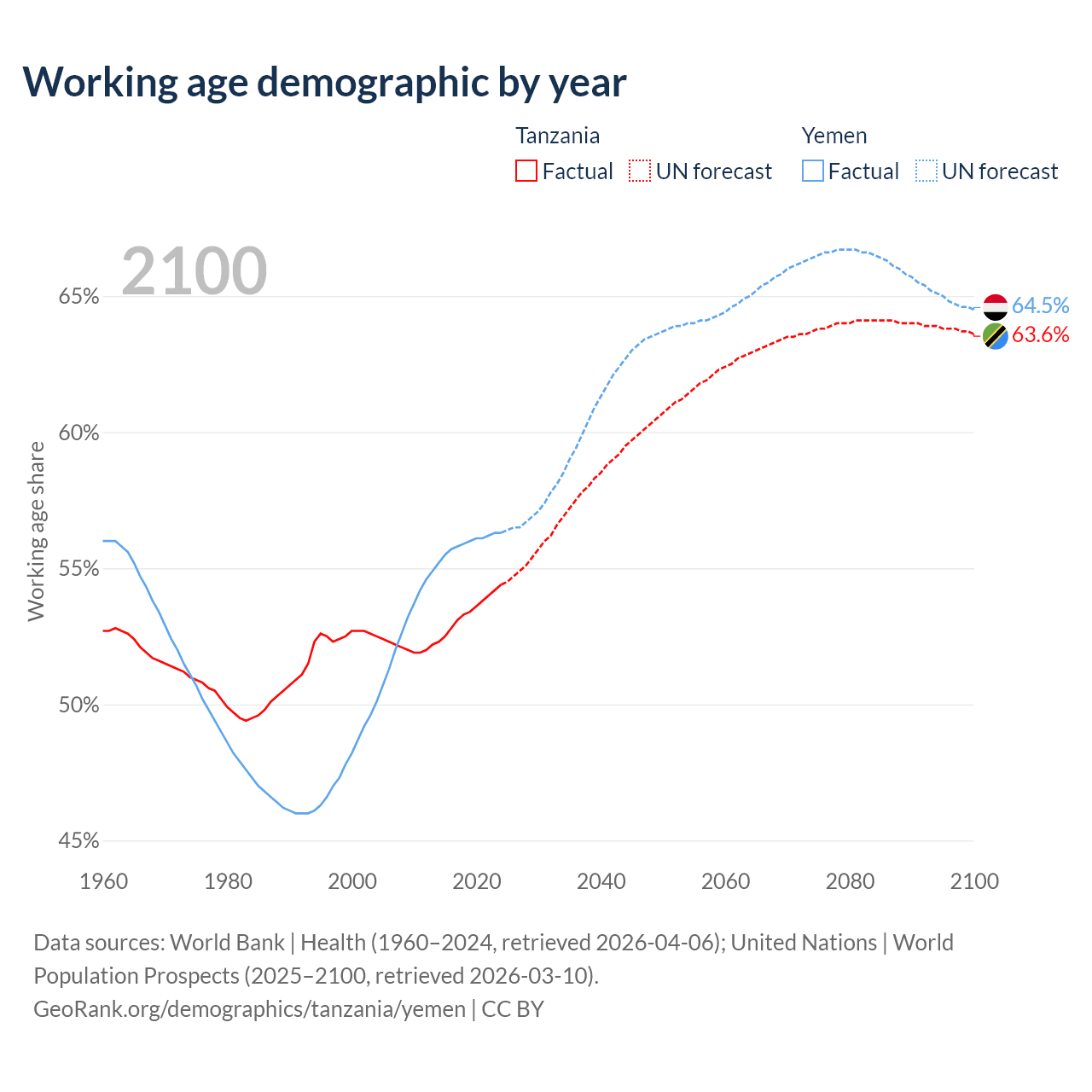 - Tanzania has 39.8M working age adults (aged 15-64) vs 24.4M in Yemen.