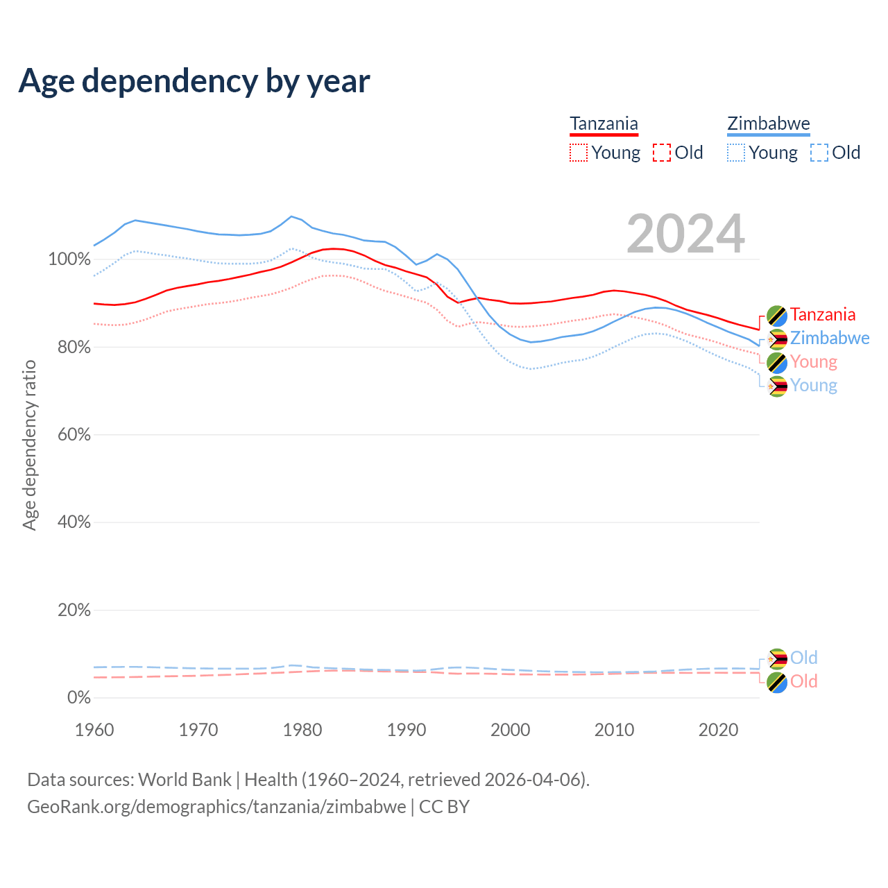 - Tanzania is ranked 184/196 by median age (oldest to youngest) vs 177/196 for Zimbabwe.