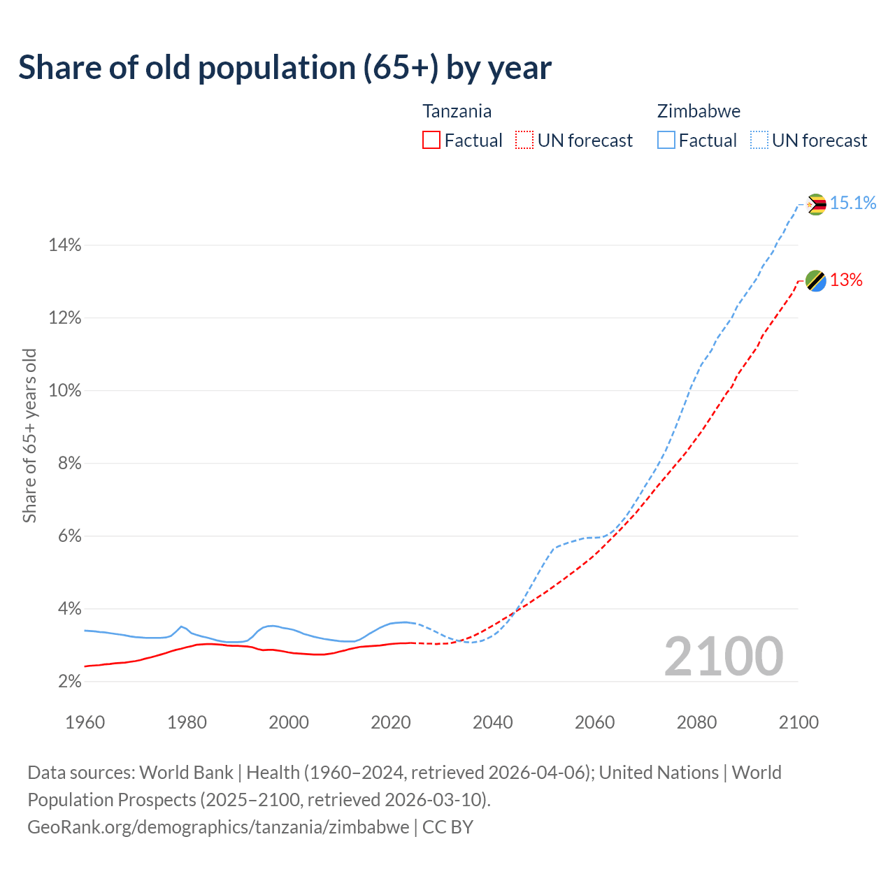 The share of older people aged 65 and over is 3.05% in Tanzania and 3.6% in Zimbabwe. Life expectancy in Tanzania compared to Zimbabwe .