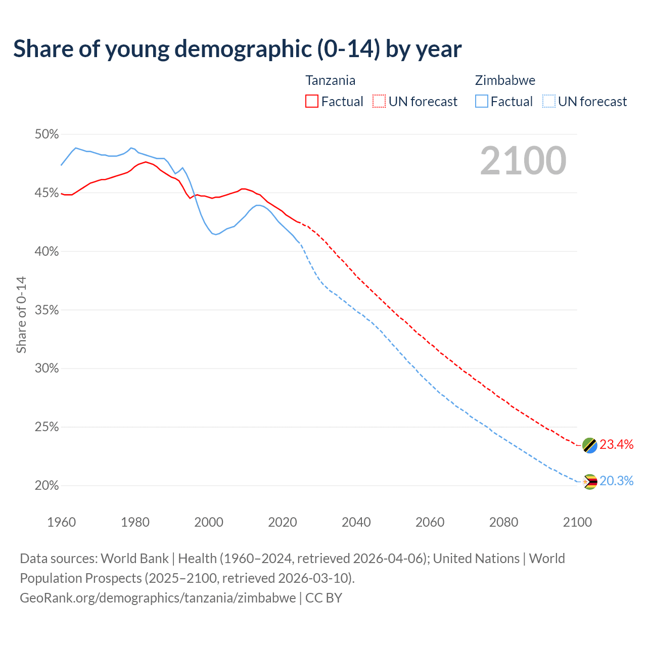 - The share of young demographic (0-15 years old) in Tanzania is 42.5% vs 40.9% in Zimbabwe.
