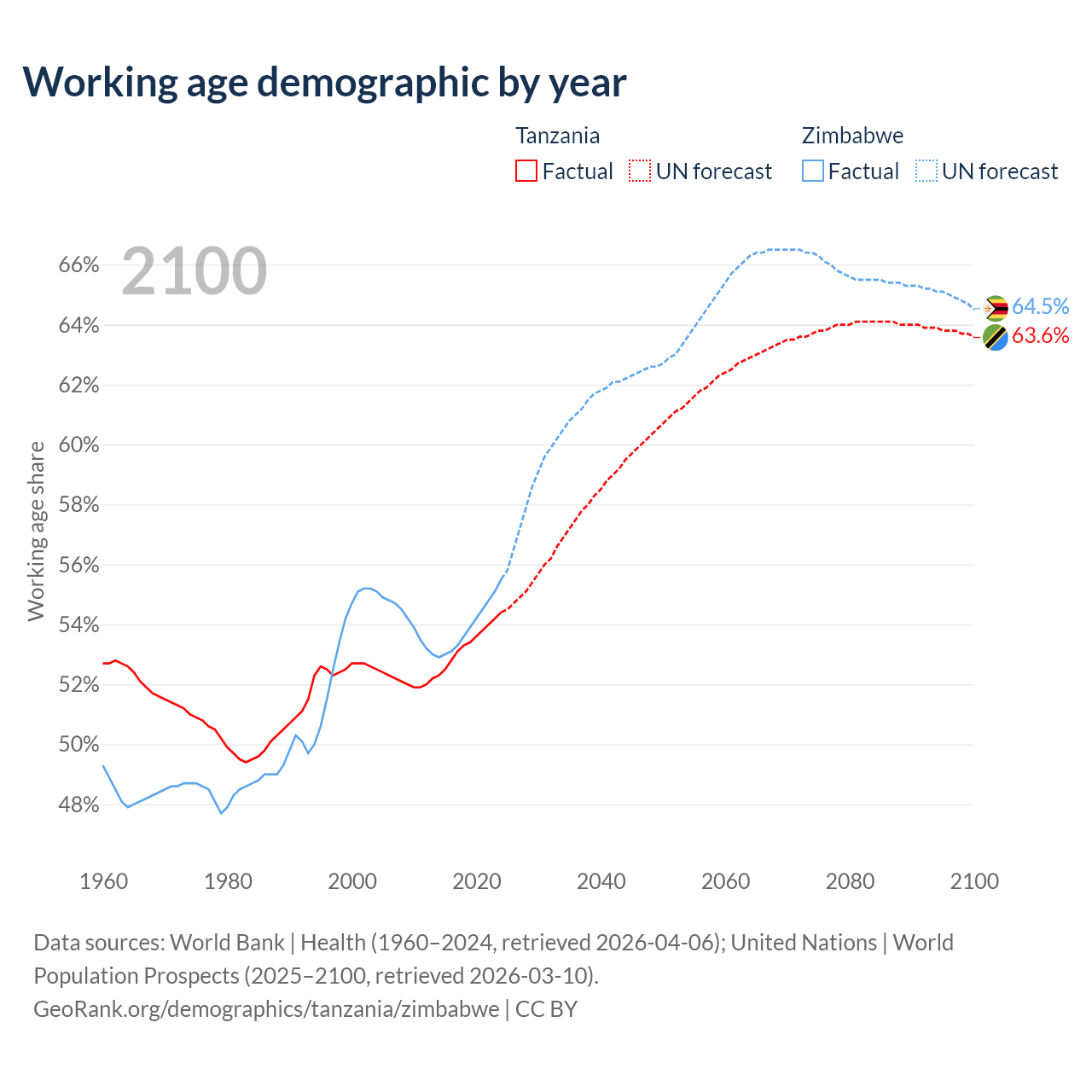 - Tanzania has 39.8M working age adults (aged 15-64) vs 9.64M in Zimbabwe.