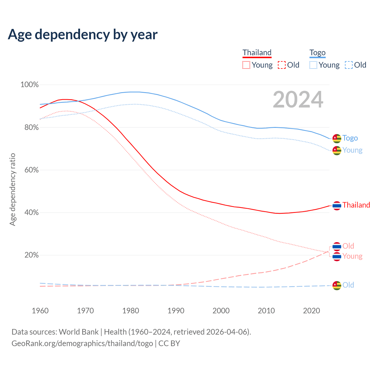 The share of older people aged 65 and over is 15.4% in Thailand and 3.21% in Togo. Life expectancy in Thailand compared to Togo .