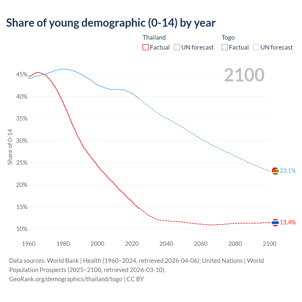 - The share of young demographic (0-15 years old) in Thailand is 14.7% vs 39.5% in Togo.