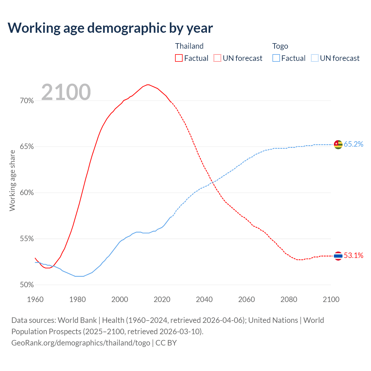 - Thailand has 50M working age adults (aged 15-64) vs 5.72M in Togo.