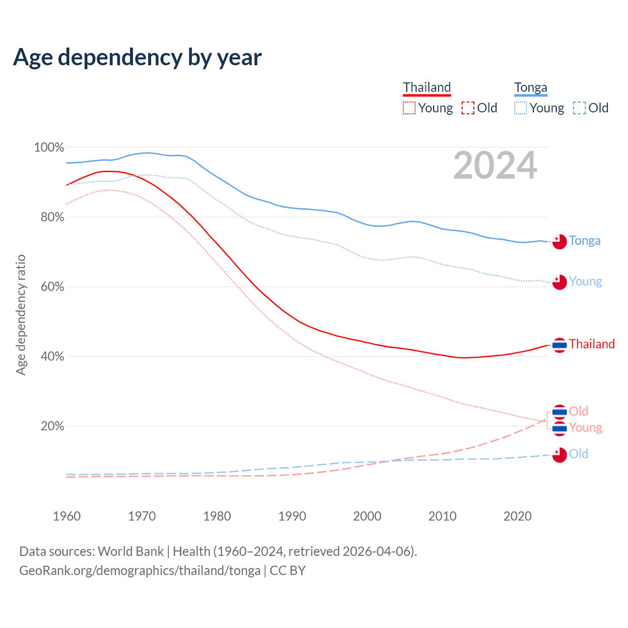 Data sources: World Bank | Health (1960–2024, retrieved 2026-04-06); U.S. Census Bureau (1960–2024, retrieved 2026-02-08).