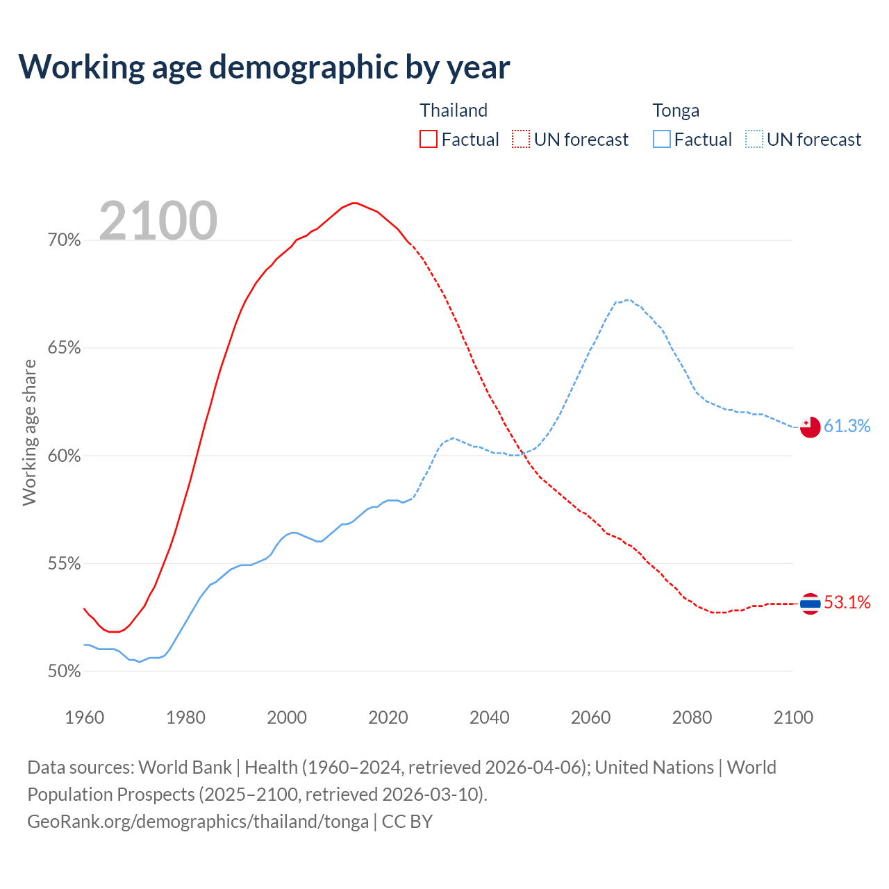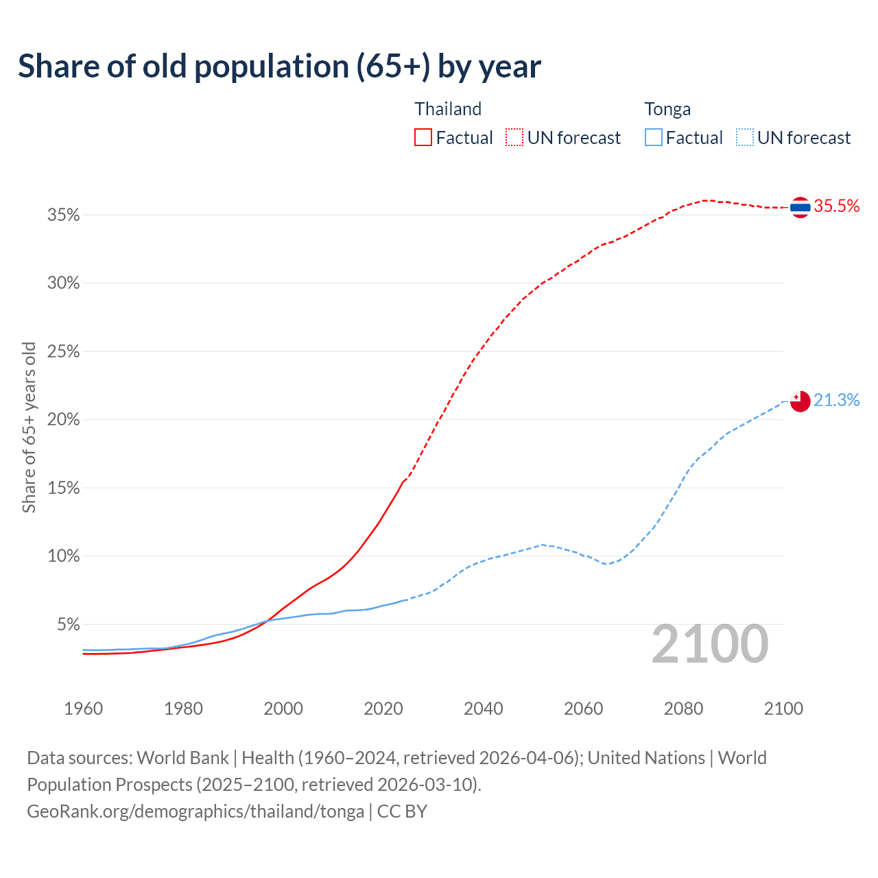 Median age Thailand vs Tonga, 1960-2100