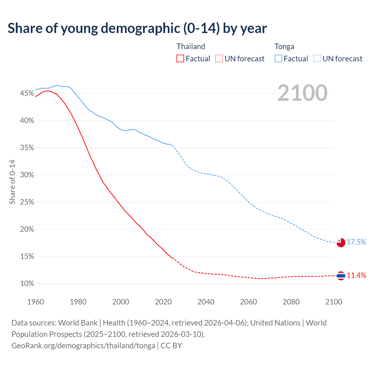- The share of young demographic (0-15 years old) in Thailand is 14.7% vs 35.4% in Tonga.
