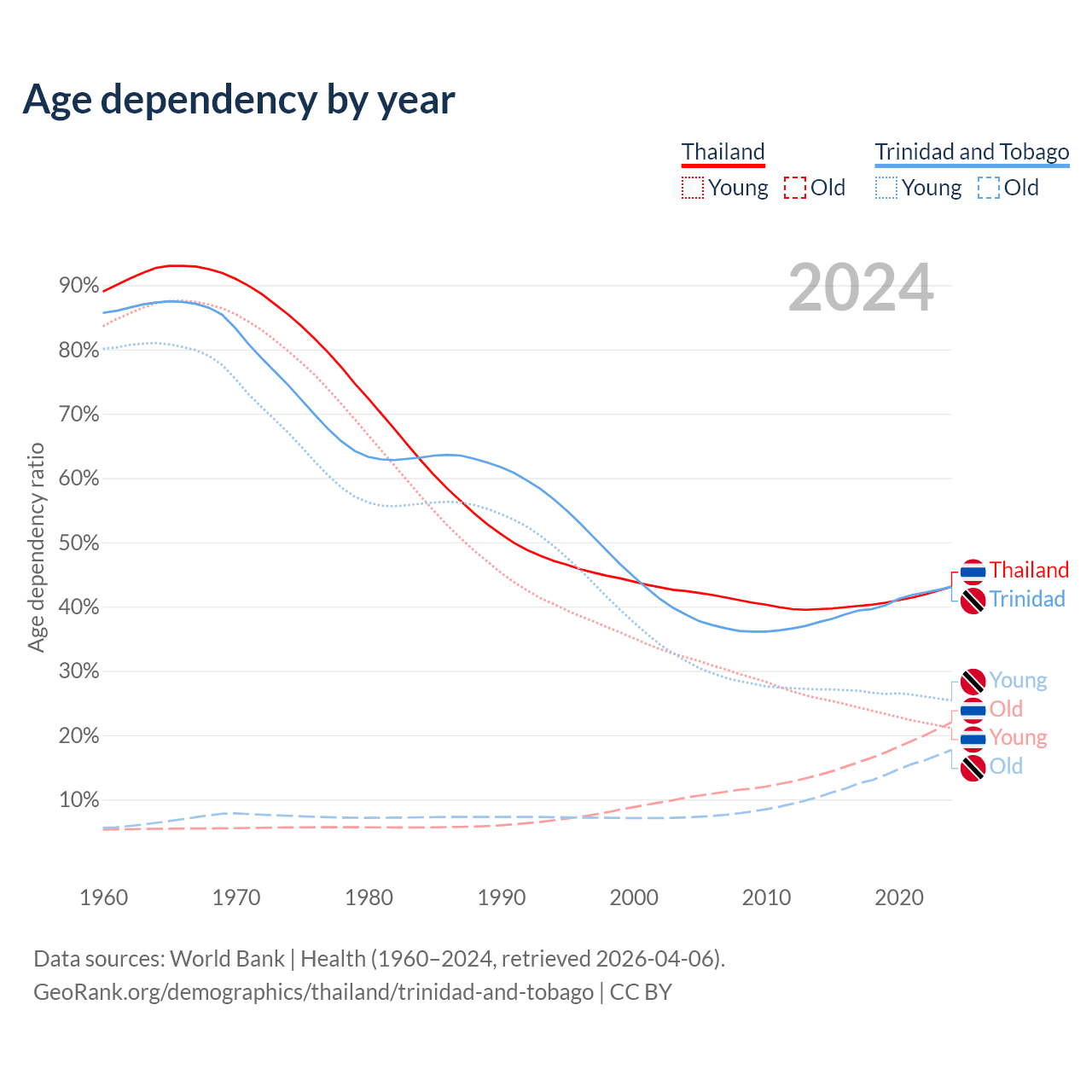 - Thailand is ranked 40/196 by median age (oldest to youngest) vs 58/196 for Trinidad and Tobago.