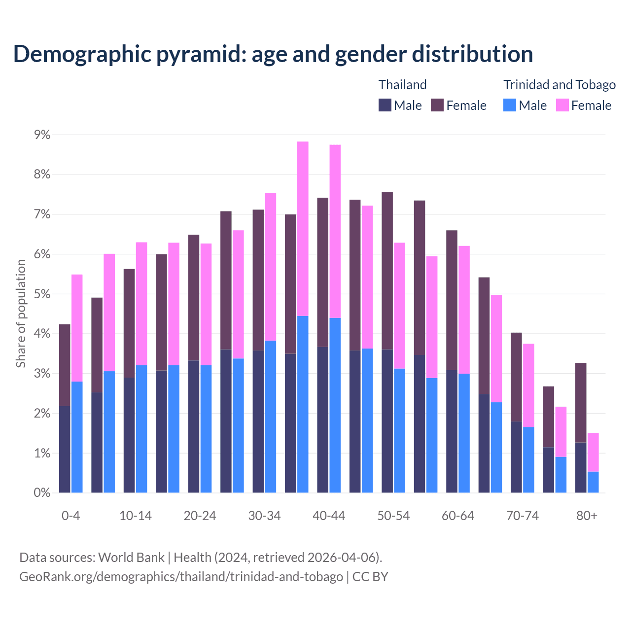 - The median age in Thailand is 41.1 years compared to 38.2 years in Trinidad and Tobago.