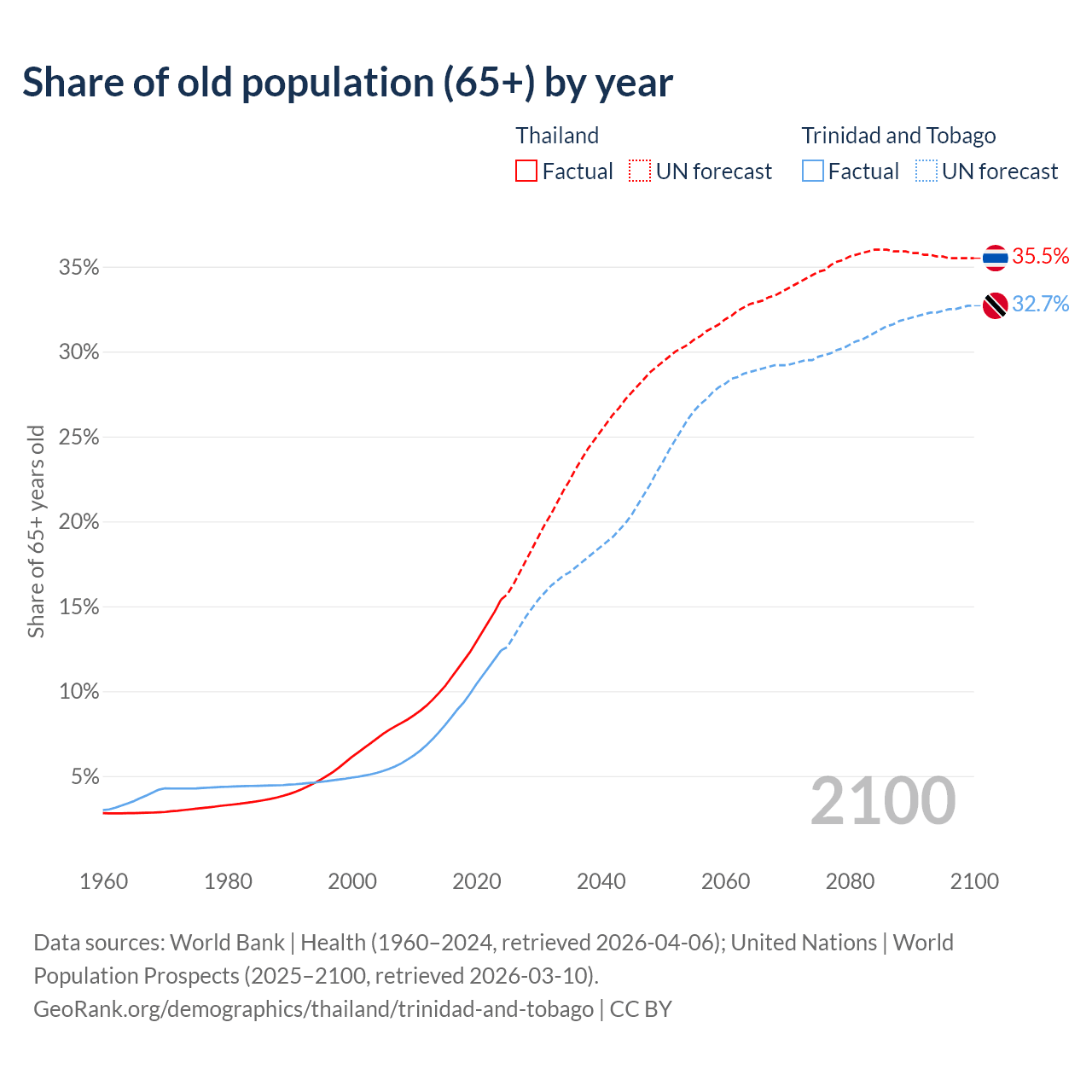 The share of older people aged 65 and over is 15.4% in Thailand and 12.4% in Trinidad and Tobago. Life expectancy in Thailand compared to Trinidad and Tobago .