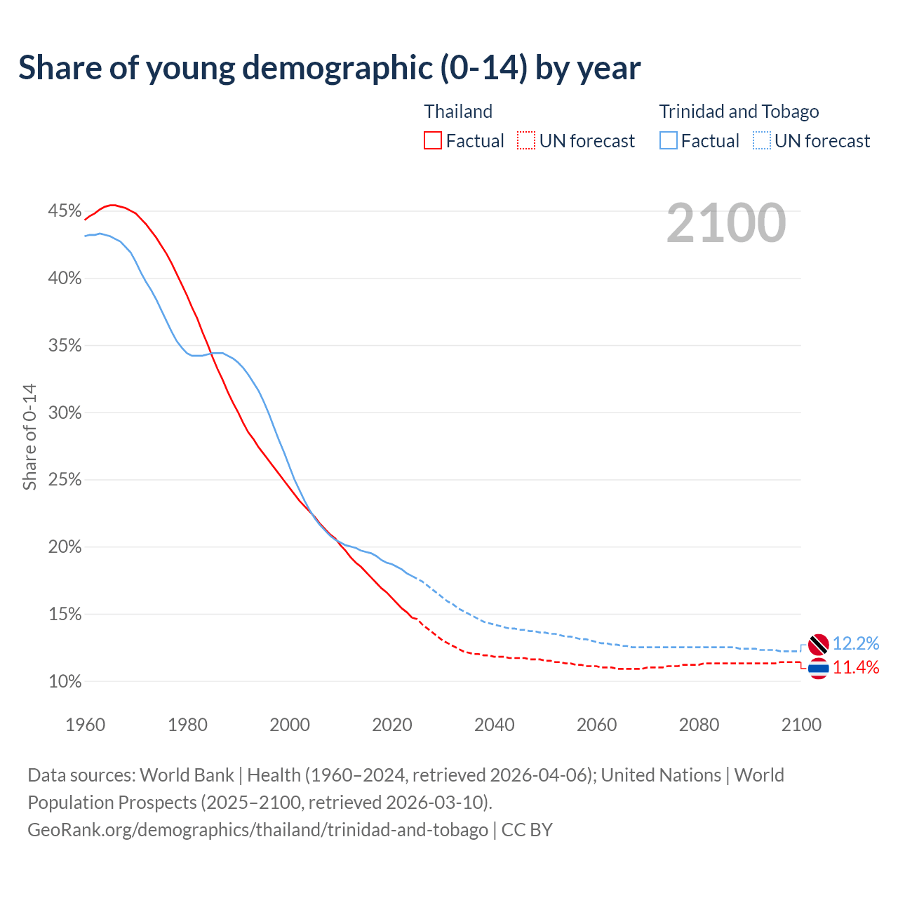 - The share of young demographic (0-15 years old) in Thailand is 14.7% vs 17.8% in Trinidad and Tobago.