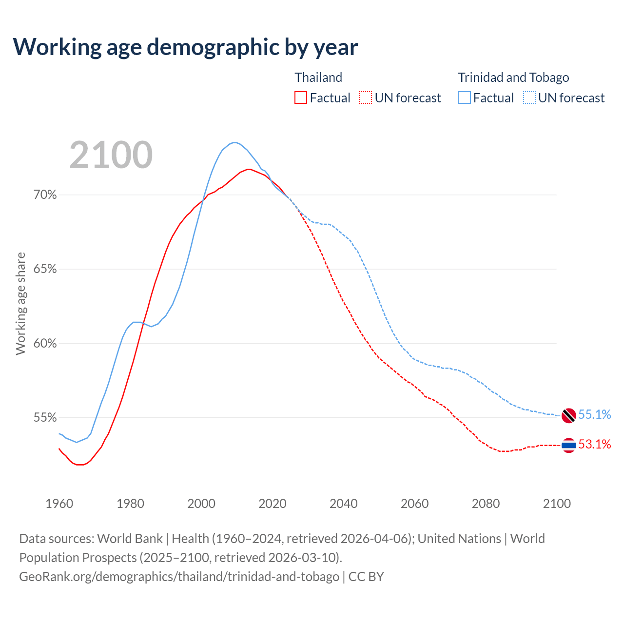 - Thailand has 50M working age adults (aged 15-64) vs 960K in Trinidad and Tobago.