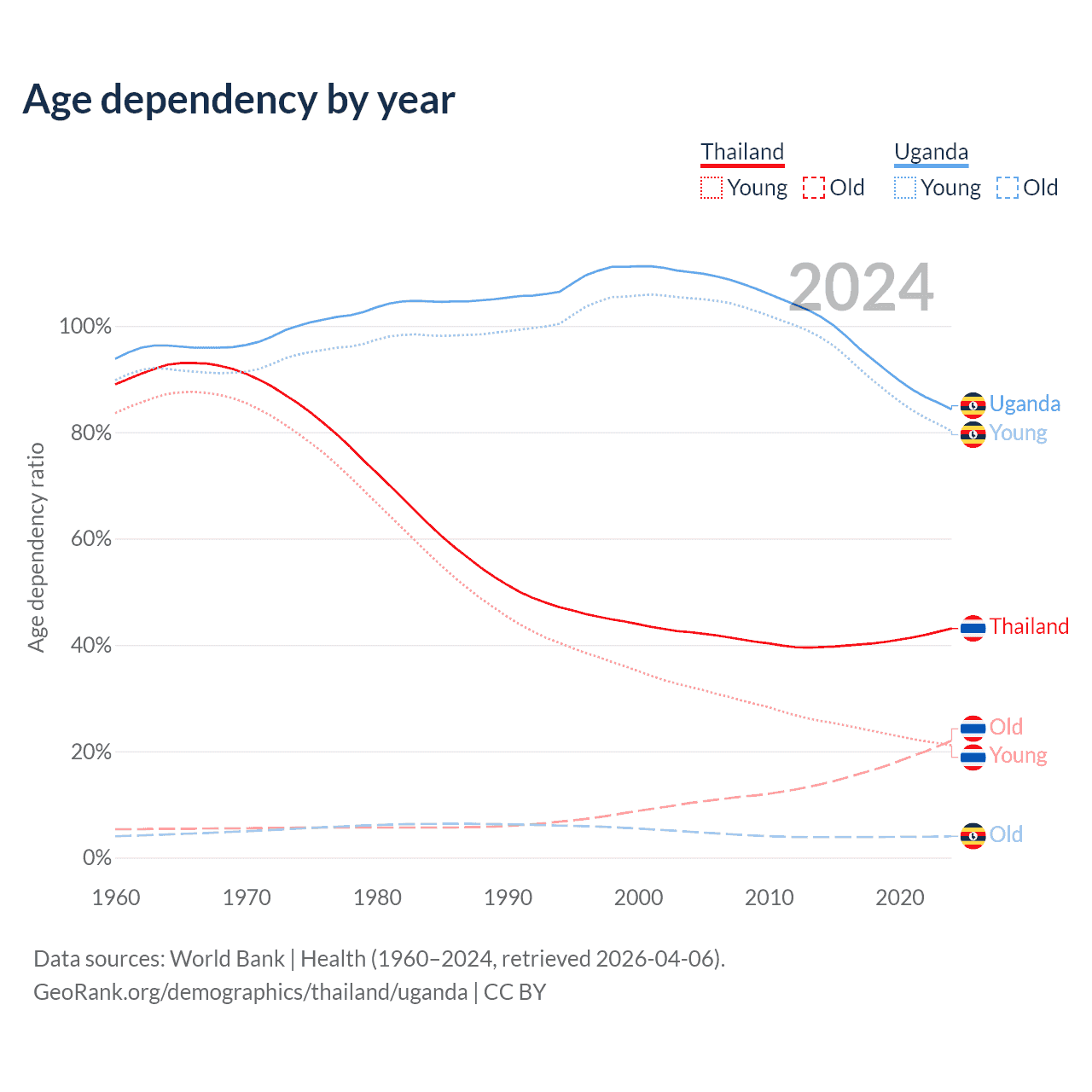 - Thailand is ranked 40/196 by median age (oldest to youngest) vs 187/196 for Uganda.
