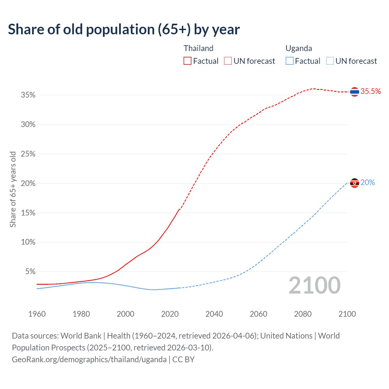 The share of older people aged 65 and over is 15.4% in Thailand and 2.19% in Uganda. Life expectancy in Thailand compared to Uganda .