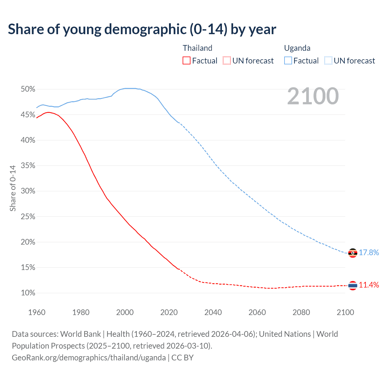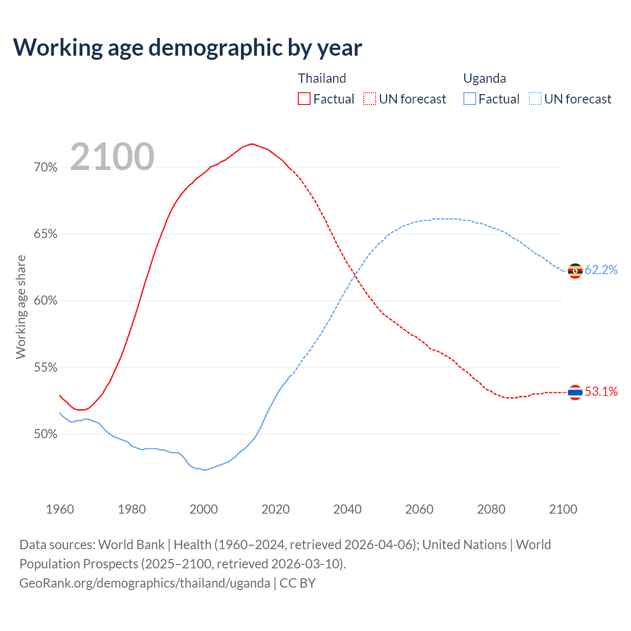 Median age Thailand vs Uganda, 1960-2100