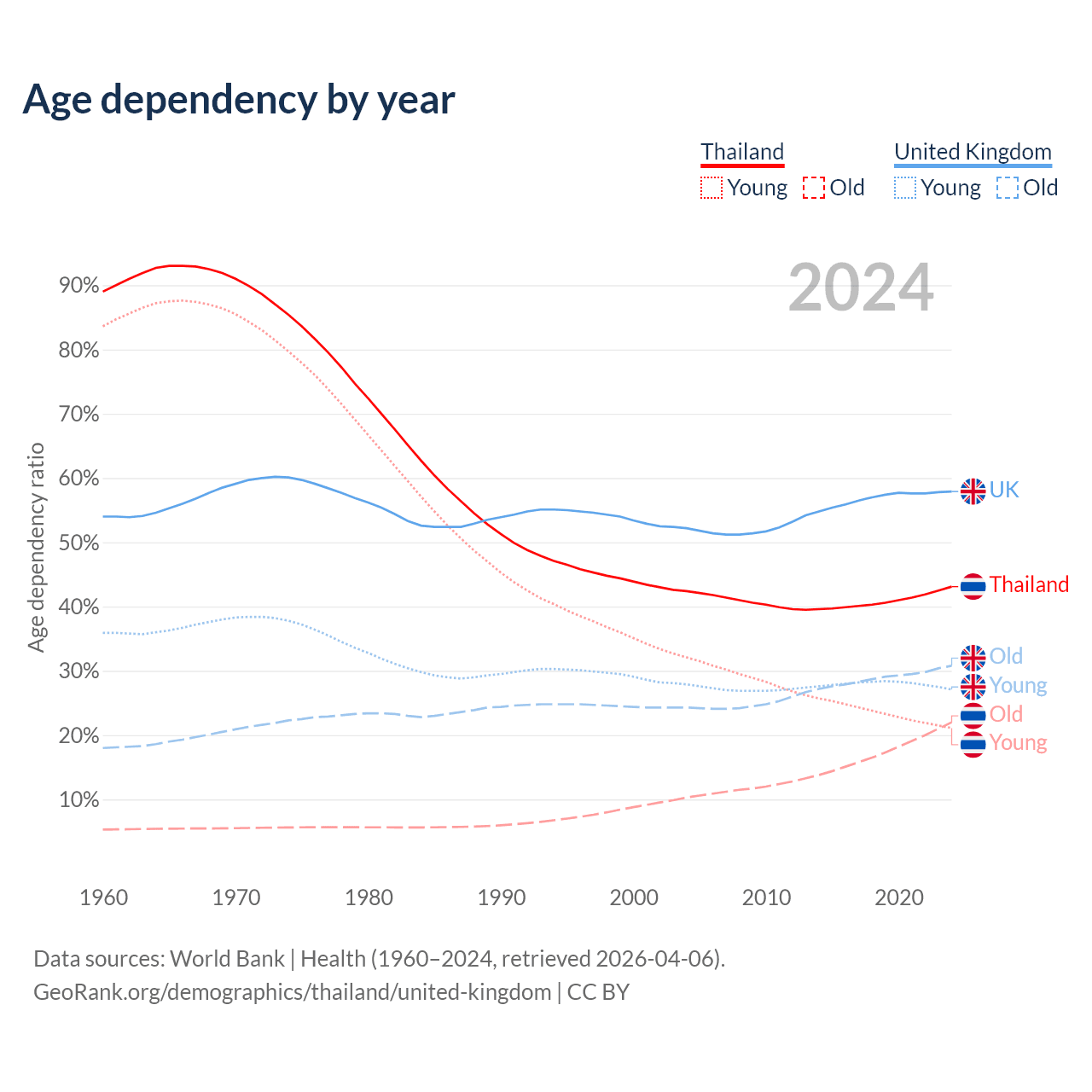 Data sources: World Bank | Health (1960–2024, retrieved 2026-04-06); U.S. Census Bureau (1960–2024, retrieved 2026-02-08).
